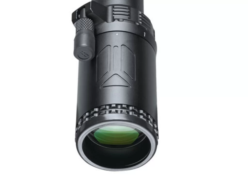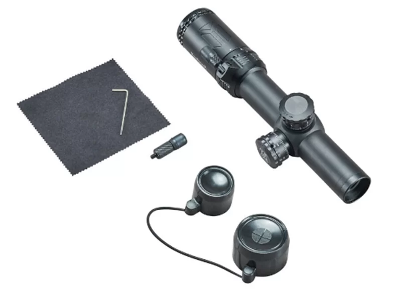 Прицел имеет световой диаметр объектива 24 мм, и сменный диапазон кратности от 1х до 4х. На оптические поверхности стекло/воздух нанесено многослойное просветляющее покрытие с антибликовым эффектом Fully Multi-Coated. В комплекте поставки есть рычаг, который ввинчивается в специальное гнездо на окулярном узле. Аксессуар позволяет манипулировать настройками оптики одним пальцем. Отстройка от параллакса выполнена на заводе изготовителе на минимальную дистанцию 100 ярдов. Окулярная точка вынесена на комфортное для работы крупным калибром расстояние.