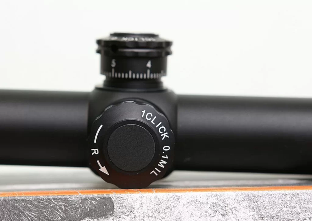 Низкопрофильные барабаны ввода правок открытого типа не мешают обзору. Цена клика 1/10 Mil, стрелкам доступен запас хода на дальность и ветер по 34,9 Мil.