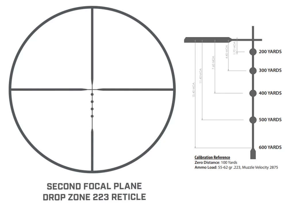 Сетка DropZone-223 BDC создавалась разработчиками под распространенный патрон калибра .223. Нижняя направляющая имеет ряд BDC меток, указывающих на точку попадания пуль весом 55-62 гран через каждые 100 ярдов. Расположение во второй фокальной плоскости (Second Focal Plane) удобно при стрельбе по малогабаритным и подвижным целям.