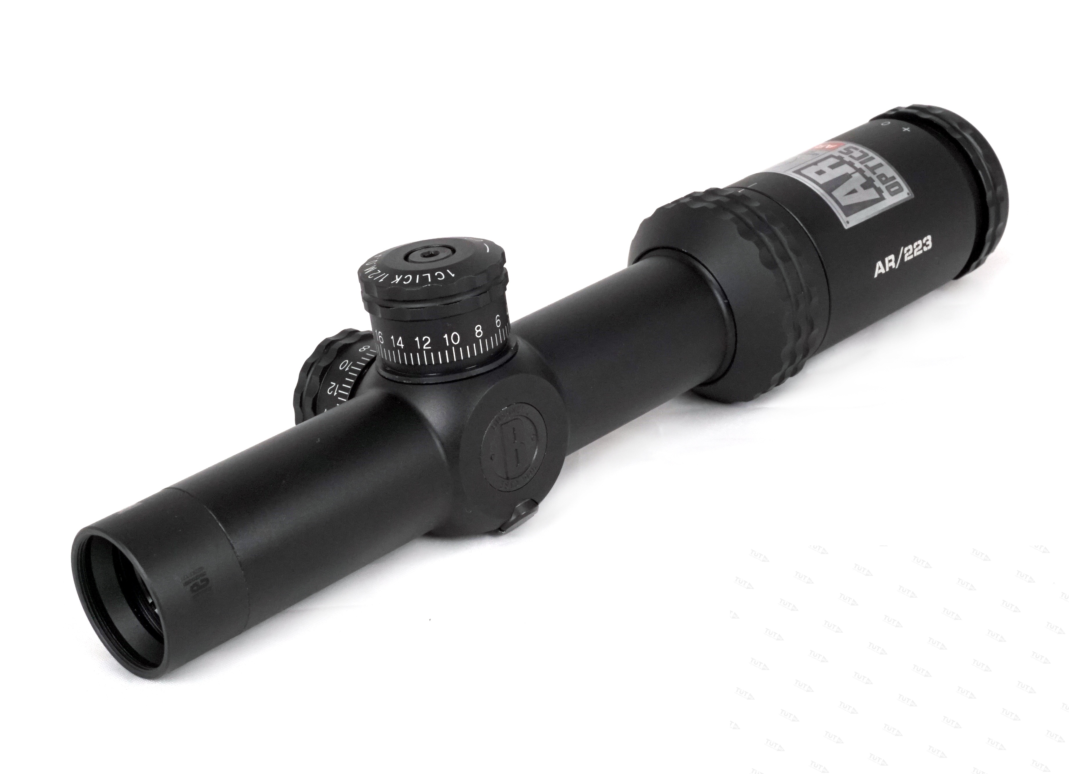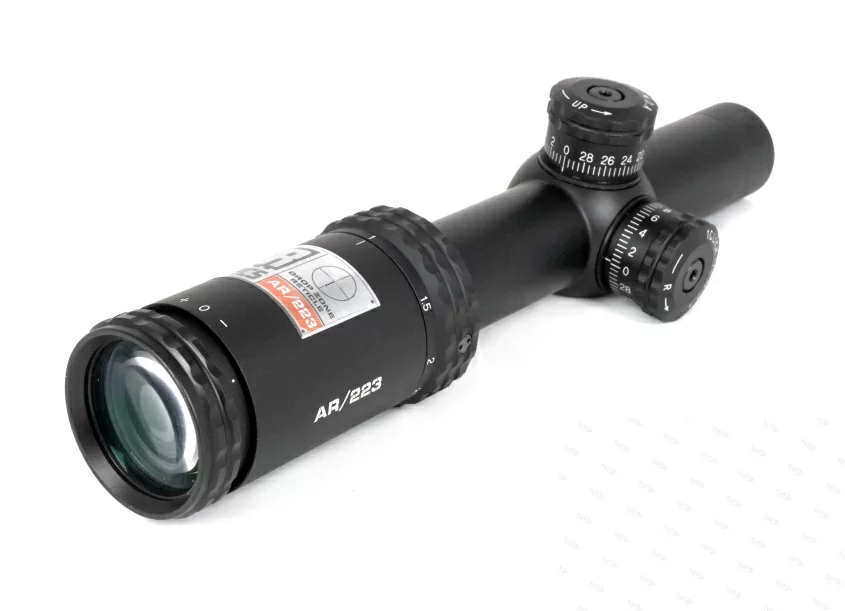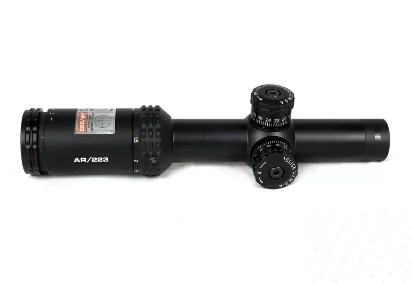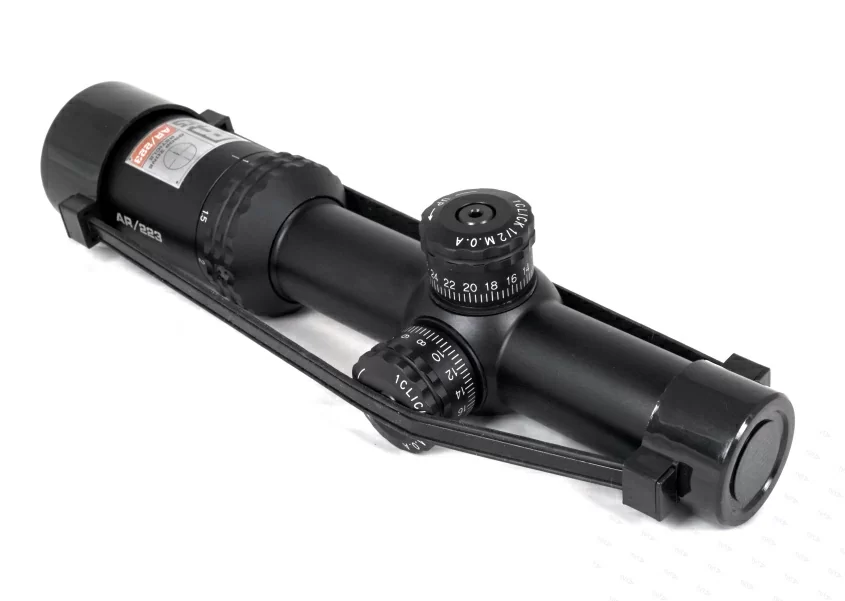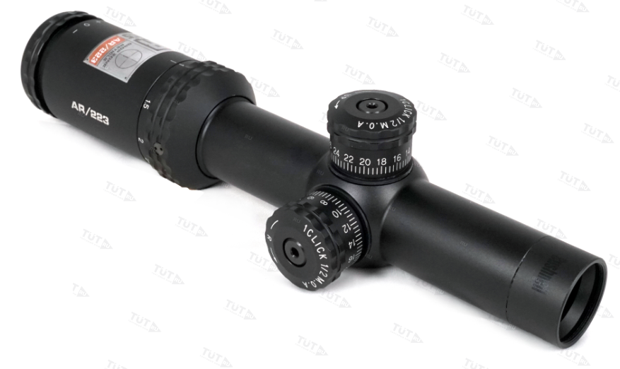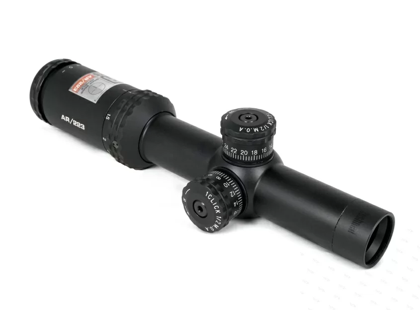 Прицел имеет световой диаметр объектива 24 мм, и сменный диапазон кратности от 1х до 4х. На оптические поверхности стекло/воздух нанесено многослойное просветляющее покрытие с антибликовым эффектом Fully Multi-Coated. В комплекте поставки есть рычаг, который ввинчивается в специальное гнездо на окулярном узле. Аксессуар позволяет манипулировать настройками оптики одним пальцем. Отстройка от параллакса выполнена на заводе изготовителе на минимальную дистанцию 100 ярдов. Окулярная точка вынесена на комфортное для работы крупным калибром расстояние.