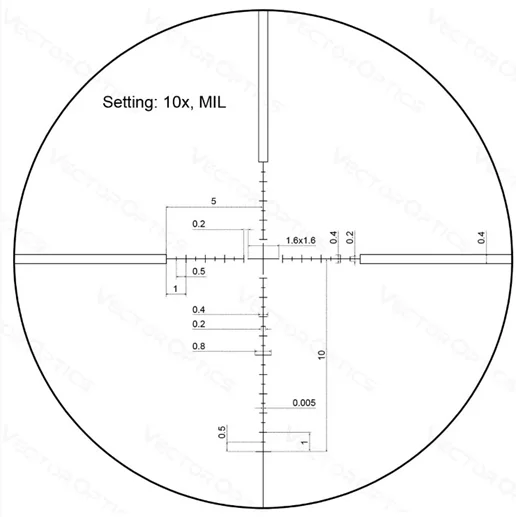 Конфигурация прицельной сетки MPR-4 напоминает расширенный вариант классического Мил-Дот, что дает возможность эффективно стрелять с коррекцией точки прицеливания и оценивать дистанцию, исходя из размеров цели. Удлиненная вертикальная направляющая позволяет поражать цели на приличном удалении, ведя огонь выносом. Эта сетка, выгравированная непосредственно на стекле и находится во второй фокальной плоскости SFP. Разметка выполнена в милах (MIL).