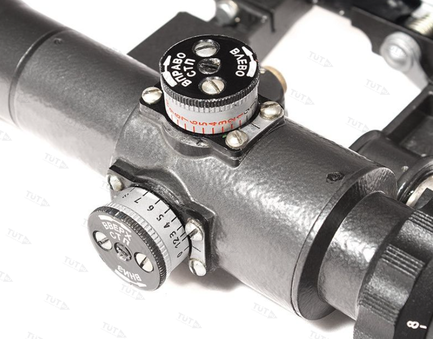 Для корректировки линии прицеливания и определения СТП используются барабанчики ввода поправок (с разметкой на белом фоне). Вращение маховичка регулировки по направлению на 0,5 деления (1 клик) соответствует перемещению линии прицеливания на 20 мм на расстоянии 100 м. Маховичок регулировки по дистанции отградуирован под баллистику патрона 7,62х54R в метрах от 0 до 1000м, с шагом 50м.