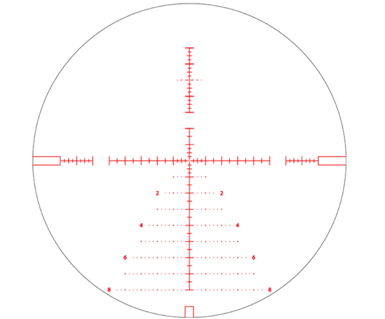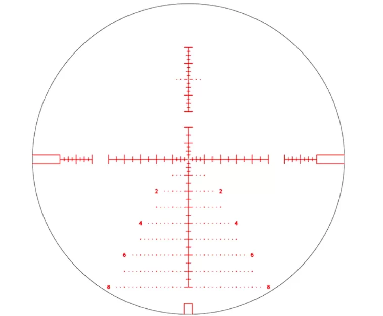 Баллистическая сетка AM9 в первой фокальной плоскости. Сетка изменяет масштаб в соответствии с текущим оптическим увеличением. Расположенная в нижней части прицельной марки горизонтальная «елочка» незаменима при расчете дальности и при расчете правок по ветру.