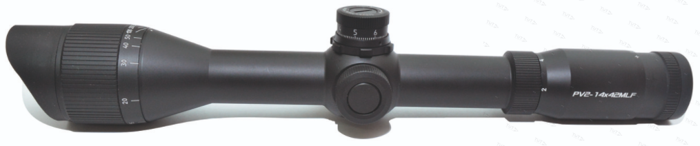 - С целью устранения эффекта параллакса прицел PV2-14x42LF снабжен узлом фокусировки объектива по дальности и обеспечивает наведение оружия на цель, находящуюся в пределах дистанции от 15 м до ∞