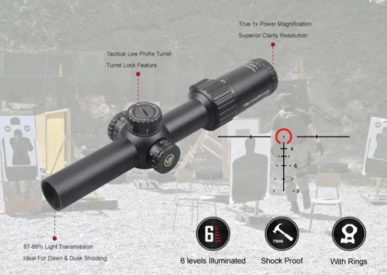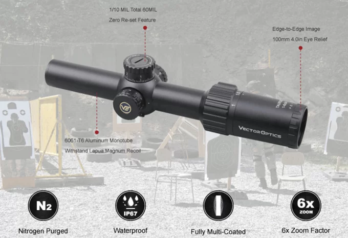 Диапазон увеличения – 1-6х, световой диаметр объектива 24 мм