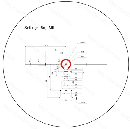 VTC-CMIL - это тактическая прицельная сетка, выгравированная непосредственно на стекле и размещенная во второй фокальной плоскости (SFP). На вертикальной оси в нижней части имеется ряд BDC-меток, позволяющих контролировать точку попадания на расстояниях до 600 ярдов. Горизонтальные деления предназначены для коррекции упреждения при стрельбе по движущимся мишеням. В центре сетки есть подсвеченный круг, облегчающий быстрый захват цели. Яркость подсветки регулируется в пределах 6-ти уровней боковым барабаном.
