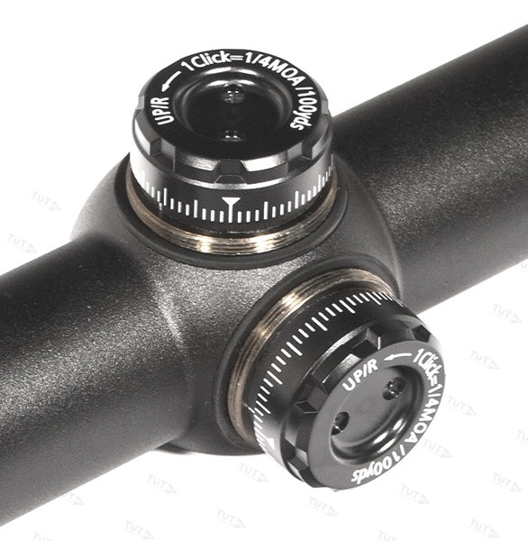 Один клик соответствует смещению точки попадания на 0,7 см (1/4 MOA) на удалении 100 м.
