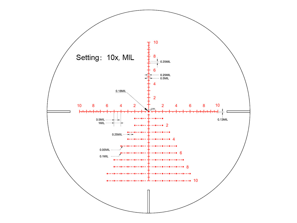 Баллистическая сетка VCT-10A (10x, SFP) — марка BDC типа, которая позволяет использовать «плавающую» точку диаметром 0,18 Mil для быстрого захвата цели и стрельбы на небольших дистанциях, а с помощью вертикальной «ёлки» работать с большими дистанциями и вносить поправки на дальность и ветер без применения пристрелочных барабанчиков. Прицельные линии тонкие и чёткие, хорошо просматриваются даже без подсветки и не перекрывают даже очень маленькие цели. Разметка перекрестья выполнена в стиле Half Mil Dot, по 10 мил в любую сторону от центра. Сетка находится на 2-м плане (SFP) и визуально не меняется при смене кратности; угловые значения элементов верны лишь при 10 кратах. Увеличение, на котором откалибрована марка, выделено на шкале кратности чёрным по белому.