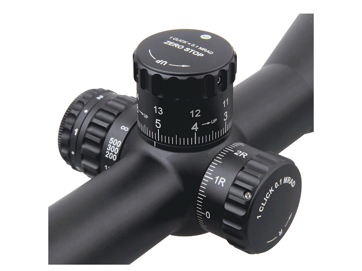 Открытые барабаны выверки с чёткими, различимыми на слух и тактильно кликами в 0,1 мрад (0,1 мил). Боковой барабан оснащён подпружиненной системой блокировки настроек, и чтобы внести поправки, понадобиться сначала отжать маховик вбок по максимуму. Верхний барабан оснащён системой Zero Stop (зеро стоп) для блокировки «нулевой» дистанции пристрелки. После блокировки барабан будет крутиться только вверх от «0», что существенно упростит возврат к первоначальным настройкам и защитит от ухода в минусовые поправки.