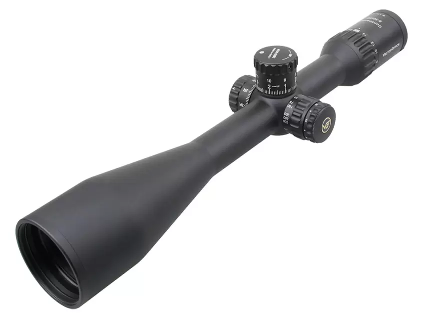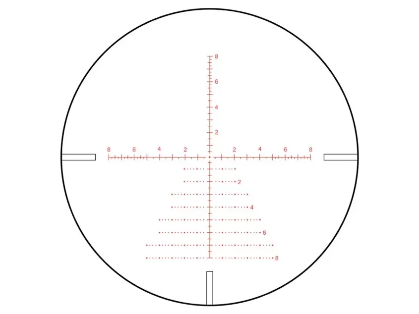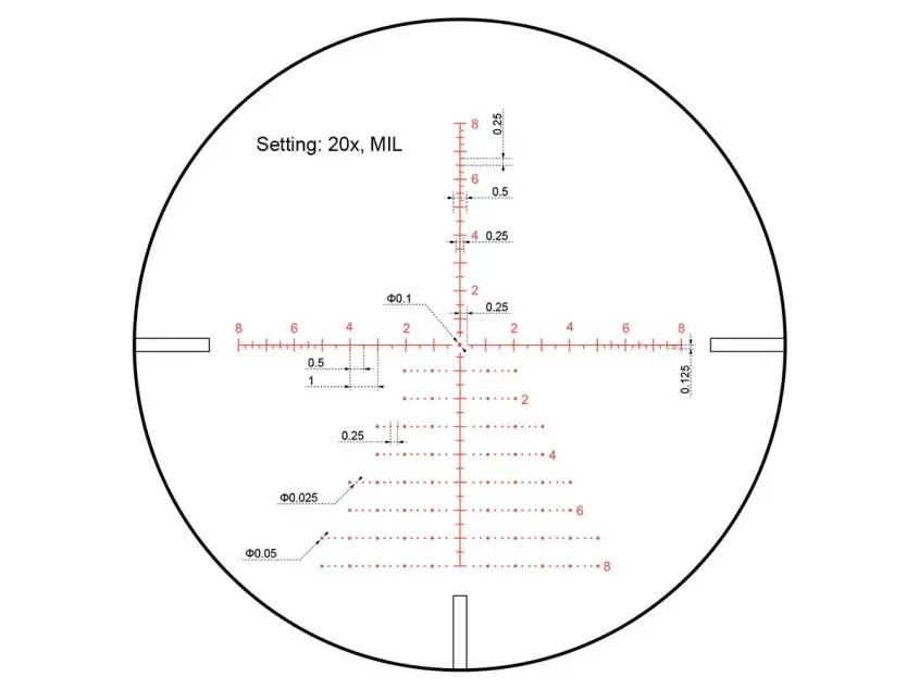 Сетка VCT20A (20x, SFP, Mil) — одна из модификаций BDC для высокоточки, с возможностью стрельбы выносом по вертикальной «ёлке». Перекрестье по типу Half Mil-Dot: миниатюрная «плавающая» точка ø0,1 mil в центре для быстрого прицеливания, направляющие с шагом 0,5 мил (по 8 мил в каждую сторону от центра) для введения поправок на дальность, ветер и боковое движение без барабанов выверки. Сетка очень тонкая и чёткая, хорошо просматривается и на 5, и на 60 кратах, не меняет видимых размеров при смене увеличения (на 2-м плане, SFP), а угловые значения элементов верны при 20x (выделено чёрным по белому на шкале увеличений).