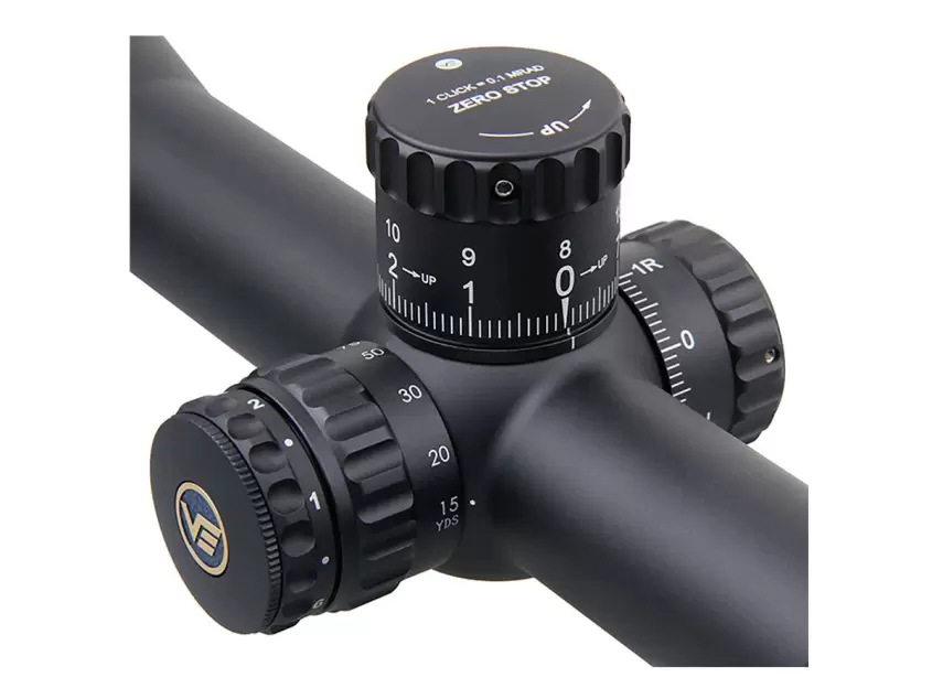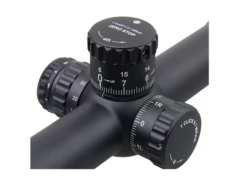 Пристрелочные барабанчики тактического типа: высокие, без крышек, с чёткими, тактильно / на слух различимыми кликами, системой блокировки положения и возможностью вносить правки, не снимая перчатки. Боковой барабан подпружиненный и крутится только в крайнем положении, т. е. если отжать (вытянуть) его вбок до упора. Верхний барабан оснащён возвратной системой Zero Stop, которая позволяет зафиксировать пристрелянный «ноль», например, на 100 м, и в дальнейшем вносить поправки на дальность только на увеличение дистанции. Таким образом можно избежать ухода в минусовые поправки и быстро возвращаться к исходным параметрам пристрелки. При установке зеро стоп не получится вносить поправки ниже «нуля», т.е. используется только 1/2 полного диапазона выверки.