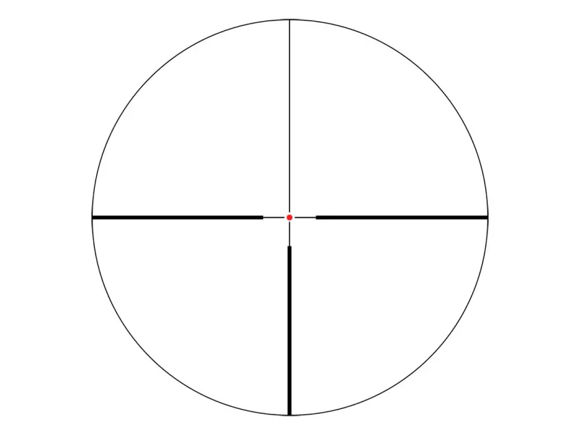 Простая охотничья сетка German #4 с подсвеченной «точкой» не перегружена разметкой, не перекрывает обзор и хорошо просматривается на любой кратности. Тонкое перекрестье быстро ловит цель, расстояние между боковыми штрихами 56,2 MOA (или 1,6 м/100 м). «Точка» диаметром 1,97 MOA, особенно подсвеченная, быстро выхватывается глазом, что позволяет быстро целиться и стрелять «на скорость». У подсветки 6 уровней, с удобным промежуточным выключением в любом из положений, отмеченных на барабане не числом, а точкой. SFP метка находится во II фок. плоскости (немасштабируемая), её изображение выглядит одинаково при любой кратности, а угловые размеры верны при 4x (отмечено на колесе увеличения чёрным по белому).