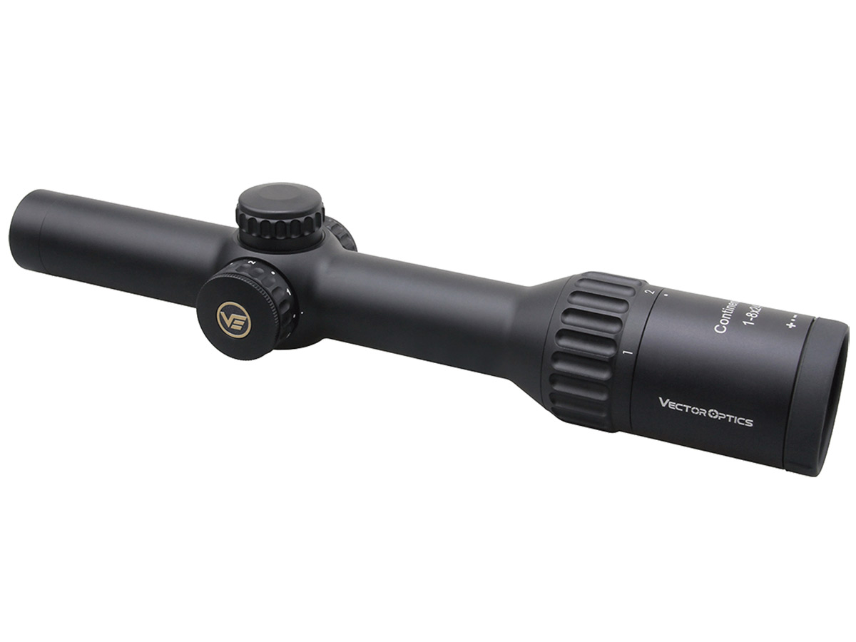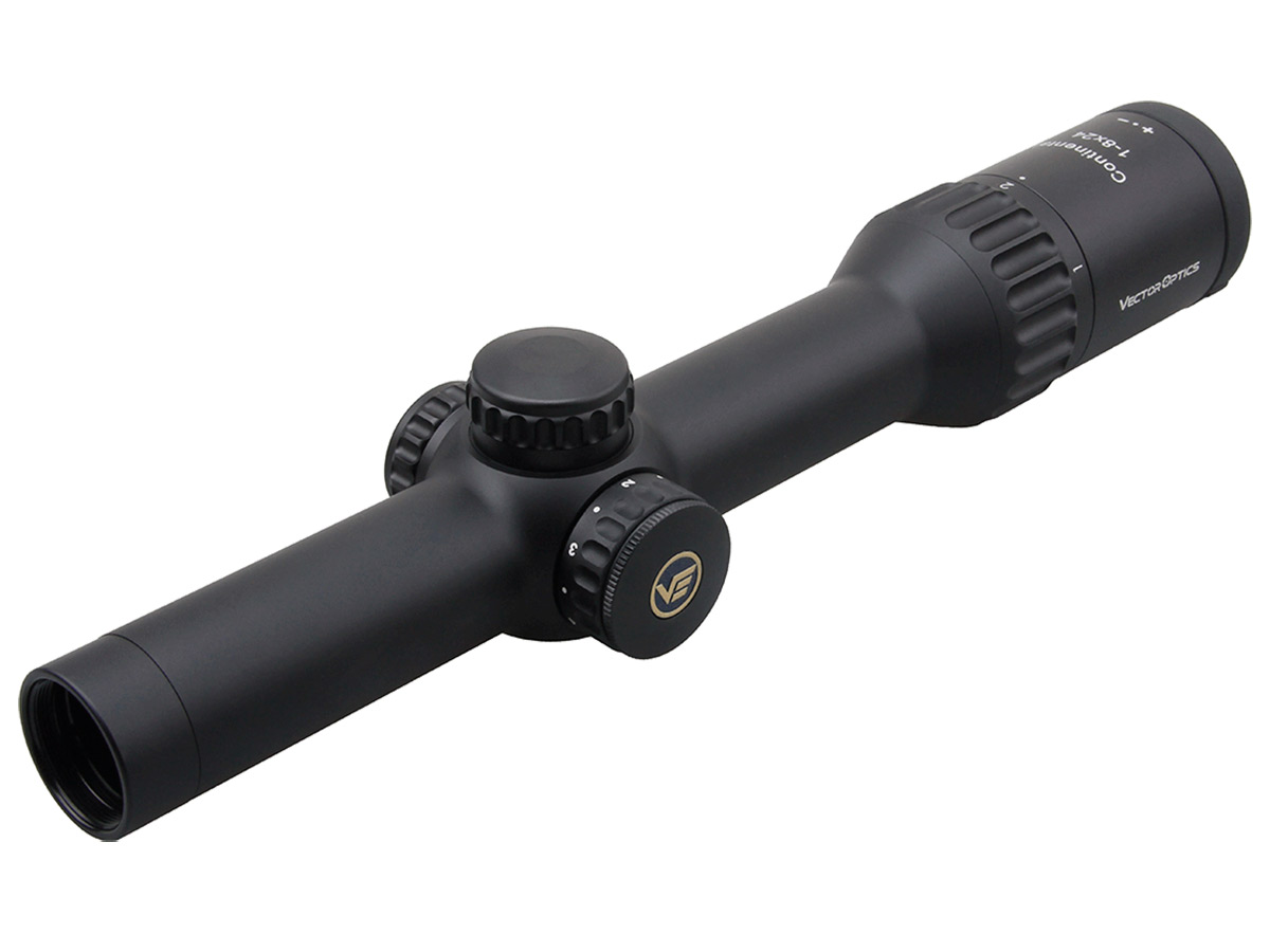 Увеличение 1...8x. ED оптика. Новый прицел с 8-кратным зумом Continental Hunting ED 1-8x24 SFP обеспечивает более качественную картинку и большую дальность действия, чем предыдущая модель серии Continental Hunting 1-6x24 SF, и при этом «вписывается» в те же вес и габариты. Низкодисперсионное ED стекло используется для компенсации хроматических аберраций. Лантановое LaREE применяется для компенсации астигматизма и дисторсии, а также для высокого разрешения по всему полю зрения. А полное просветление линз существенно улучшает яркость и контрастность. У прицела отличная обзорность без «тоннельного» эффекта, высокая светлость и светопропускание 93%, а изображение отличается высокой чёткостью и точной цветопередачей. На малой кратности цель можно охотиться и очень ранним утром, и в поздних сумерках.Простая охотничья сетка German #4 с подсвеченной «точкой» не перегружена разметкой, не перекрывает обзор и хорошо просматривается на любой кратности. Тонкое перекрестье быстро ловит цель, расстояние между боковыми штрихами 56,2 MOA (или 1,6 м/100 м). «Точка» диаметром 1,97 MOA, особенно подсвеченная, быстро выхватывается глазом, что позволяет быстро целиться и стрелять «на скорость». У подсветки 6 уровней, с удобным промежуточным выключением в любом из положений, отмеченных на барабане не числом, а точкой. SFP метка находится во II фок. плоскости (немасштабируемая), её изображение выглядит одинаково при любой кратности, а угловые размеры верны при 4x (отмечено на колесе увеличения чёрным по белому).