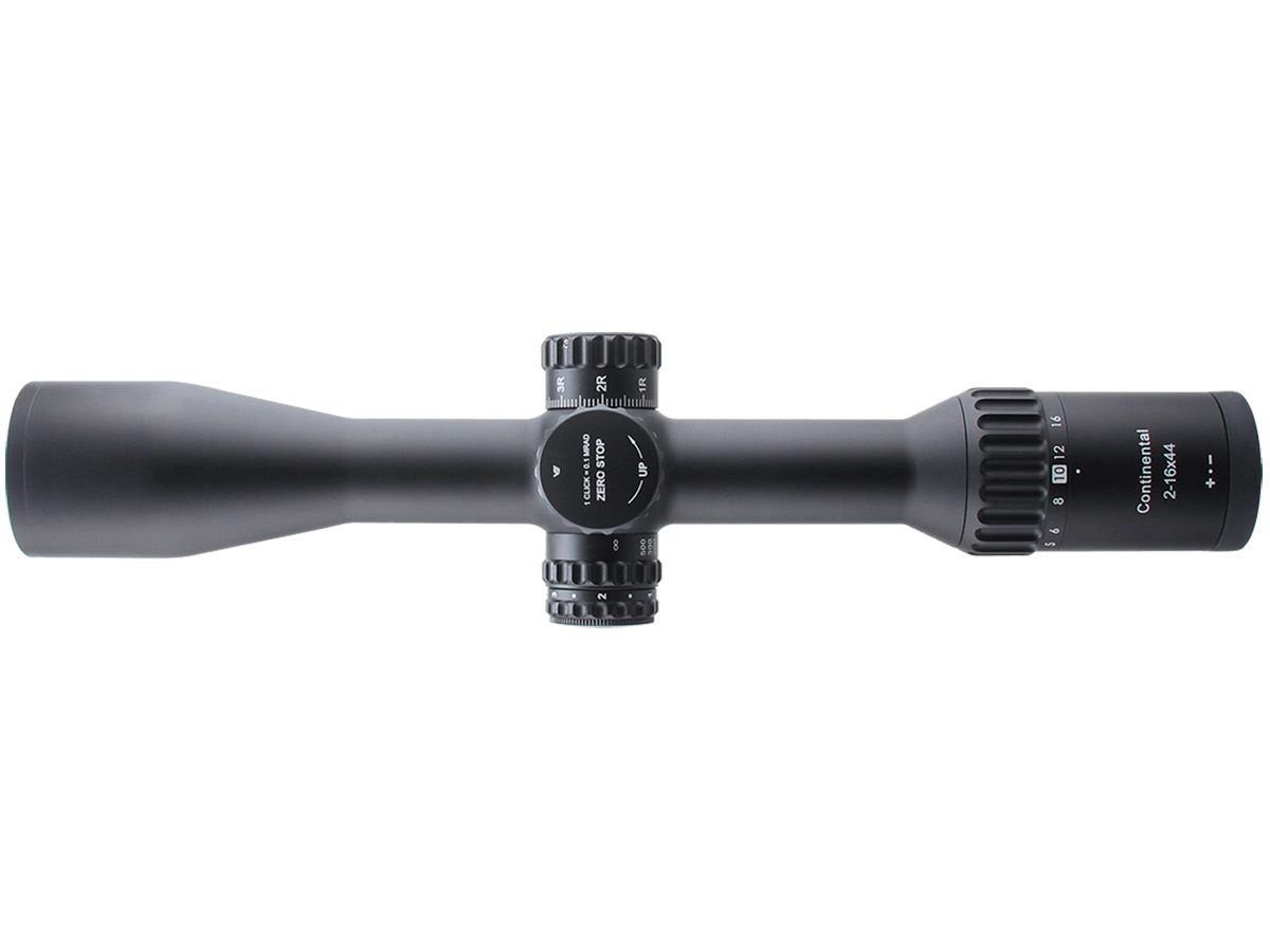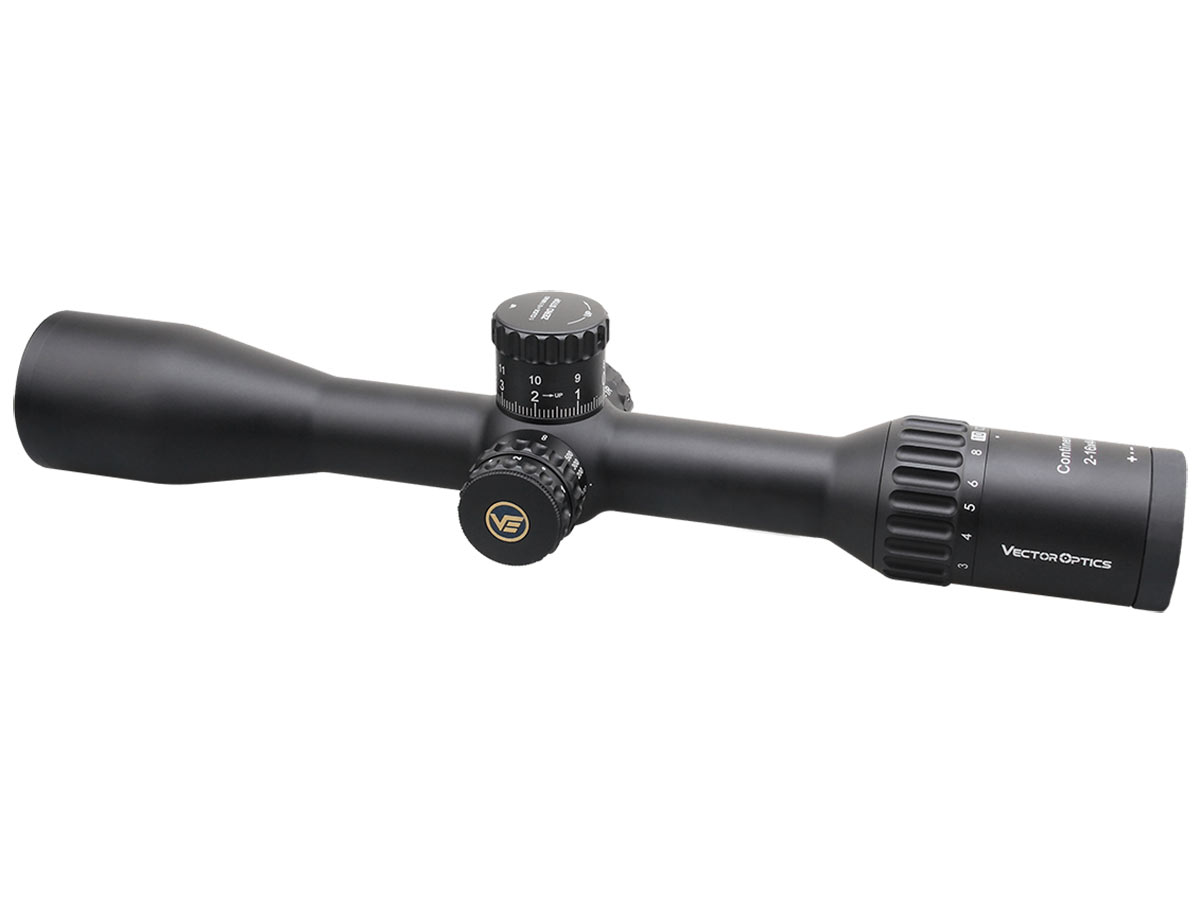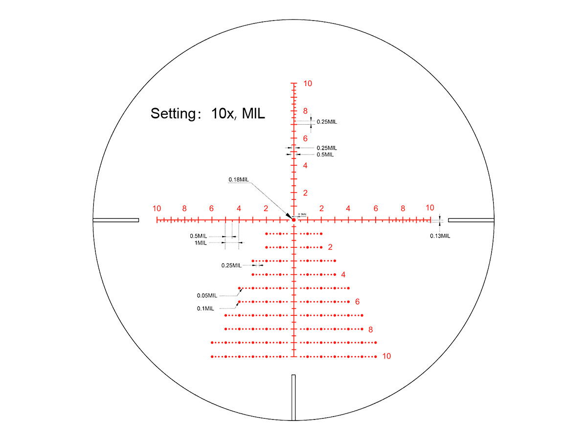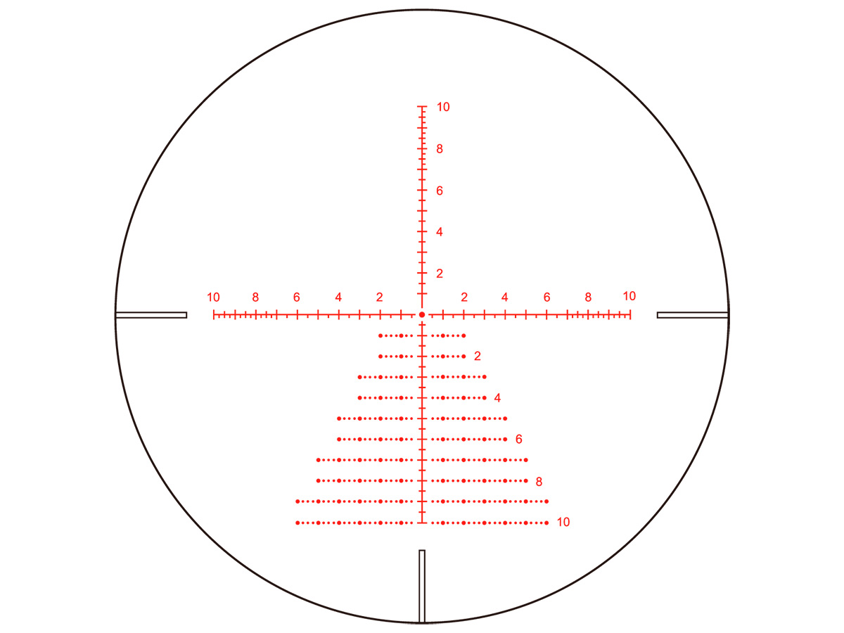 VCT-10A (SFP, 10x, Mil) — сетка BDC типа с расширенной «ёлкой» для стрельбы выносом, перекрестьем в стиле Half Mil-Dot и «плавающей» точкой в центре перекрестья для быстрого прицеливания по месту. Разметка в тех же единицах, что и у барабанов, — в милах: точка диаметром 0,18 мил, направляющие по 10 мил от центра, шаг разметки 0,25, 0,5 и 1 мил и каждый 2-й мил пронумерован. Метка не масштабируемая (SFP) и визуально никак не меняется при смене кратности, правильные угловые размеры элементов даны для 10x. Чтобы чётче обозначить метку на пёстром фоне и на ярком солнце в условиях тактической стрельбы, используется полная подсветка всех элементов, а не только центральной точки, как в базовых моделях Continental Tactical. Яркость меняется от 1 (Min) до 6 (Max), а наличие промежуточных точек позволяет быстро включать / выключать подсветку без длительного прокручивания барабана в положение OFF.
