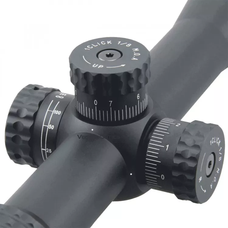 Пристрелочные барабаны тактического типа: открытые, достаточно высокие, с крупной накаткой поворотной части для удобства работы в перчатках и подпружиненной системой Pull-Up для блокировки настроек. Клики чётко различаются на слух, цена деления 1/8 МОА или 3,125 мм за один клик на дистанции 100 м.