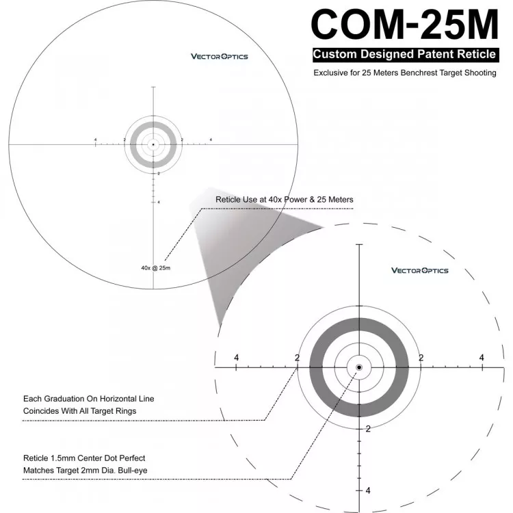 Прицельная сетка COM-25 с «плавающей» точкой спроектирована таким образом, чтобы при 40x разметка соответствовала стандартным размерам мишени для пневматического бенчреста, которая установлена на расстоянии 25 м от стрелка. Центральная точка размером 1,5 мм идеально «закроет» центр бумажной мишени, а сама мишень «впишется» точно между вертикальными и горизонтальными рисками с цифрой «2». Разметка направляющих совпадает с линиями, отмечающими кольца мишени. Также мишень целиком «укладывается» между центральной точкой и любой из крайних точек с цифрой «4», причём «яблочко» приходится строго на риску с цифрой «2». Марка простая, очень тонкая и чёткая, немасштабируемая (SFP или II фок. плоскость), лучше всего заметна при нормальном уровне освещённости.