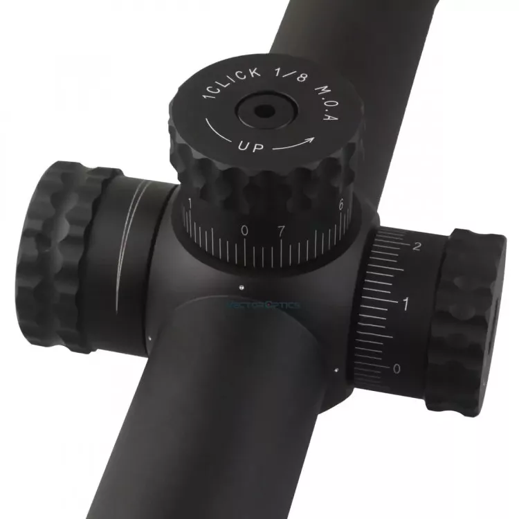 Барабаны выверки по типу тактических: высокие, с подпружиненной блокировкой настроек и крупной накаткой на поворотной части для удобства работы в перчатках. Клики чётко различаются на слух, цена деления 1/8 МОА или 3,125 мм за один клик на дистанции 100 м.
