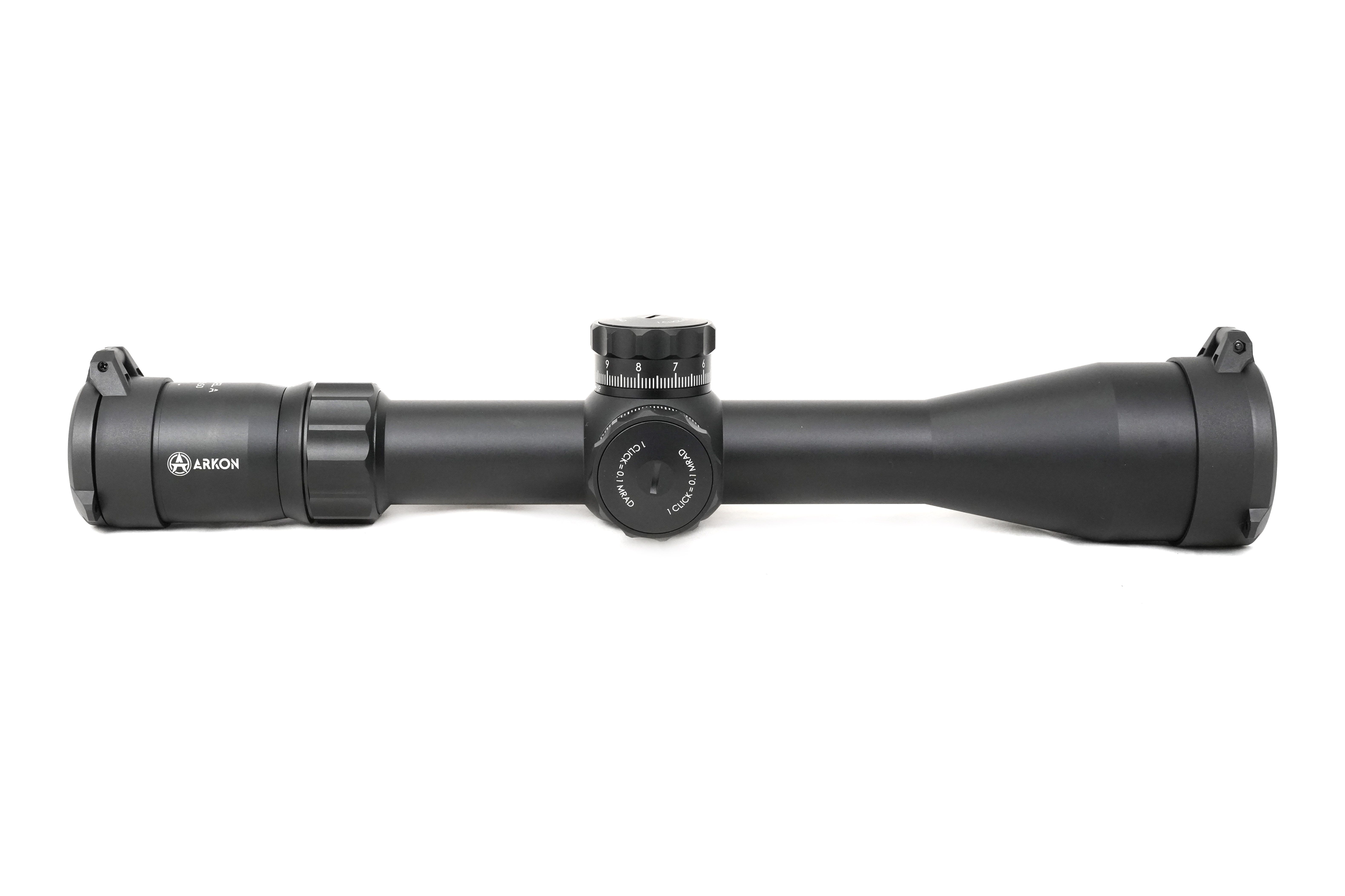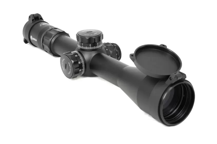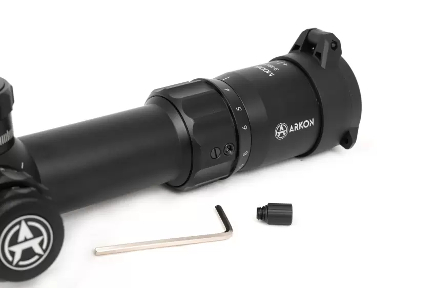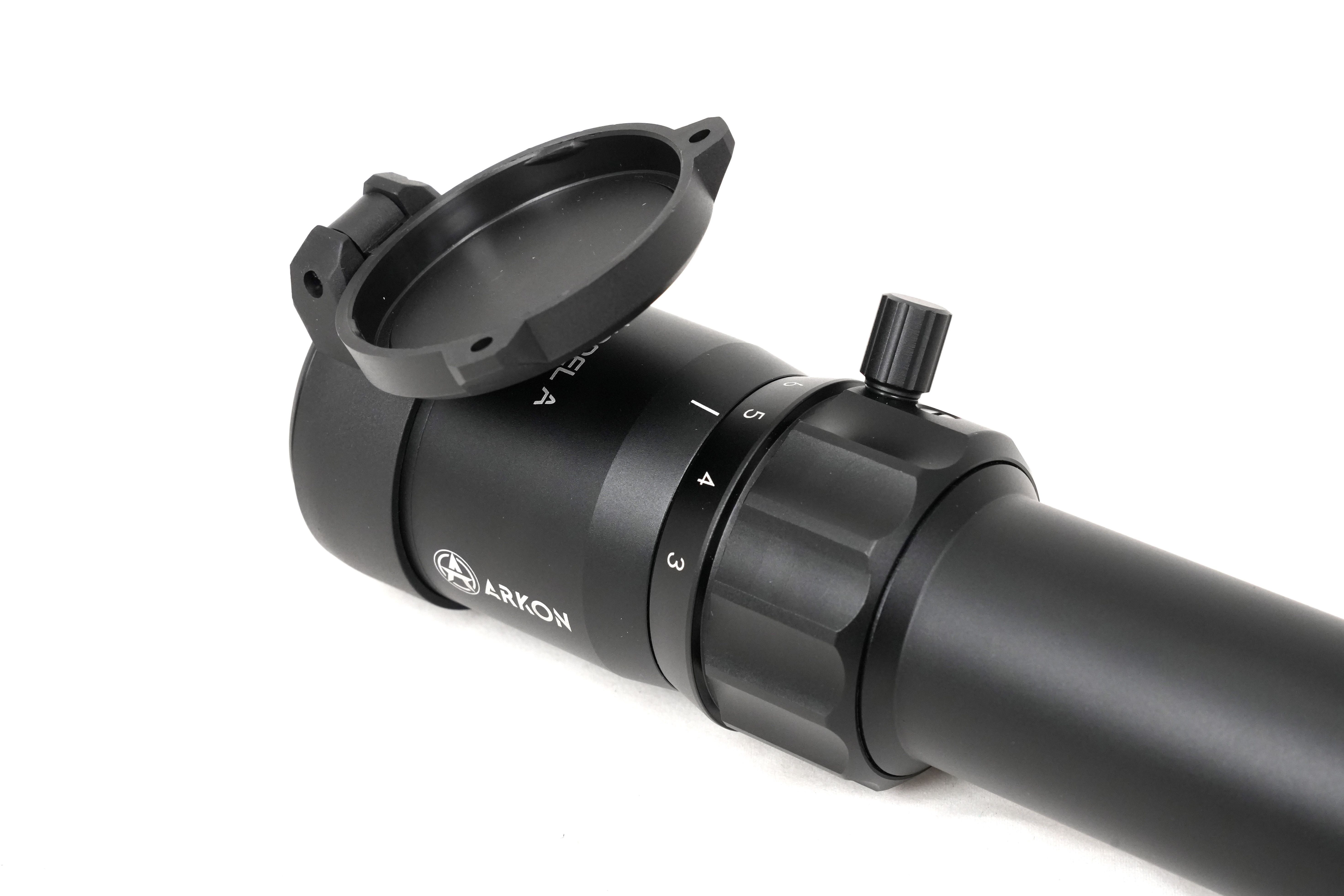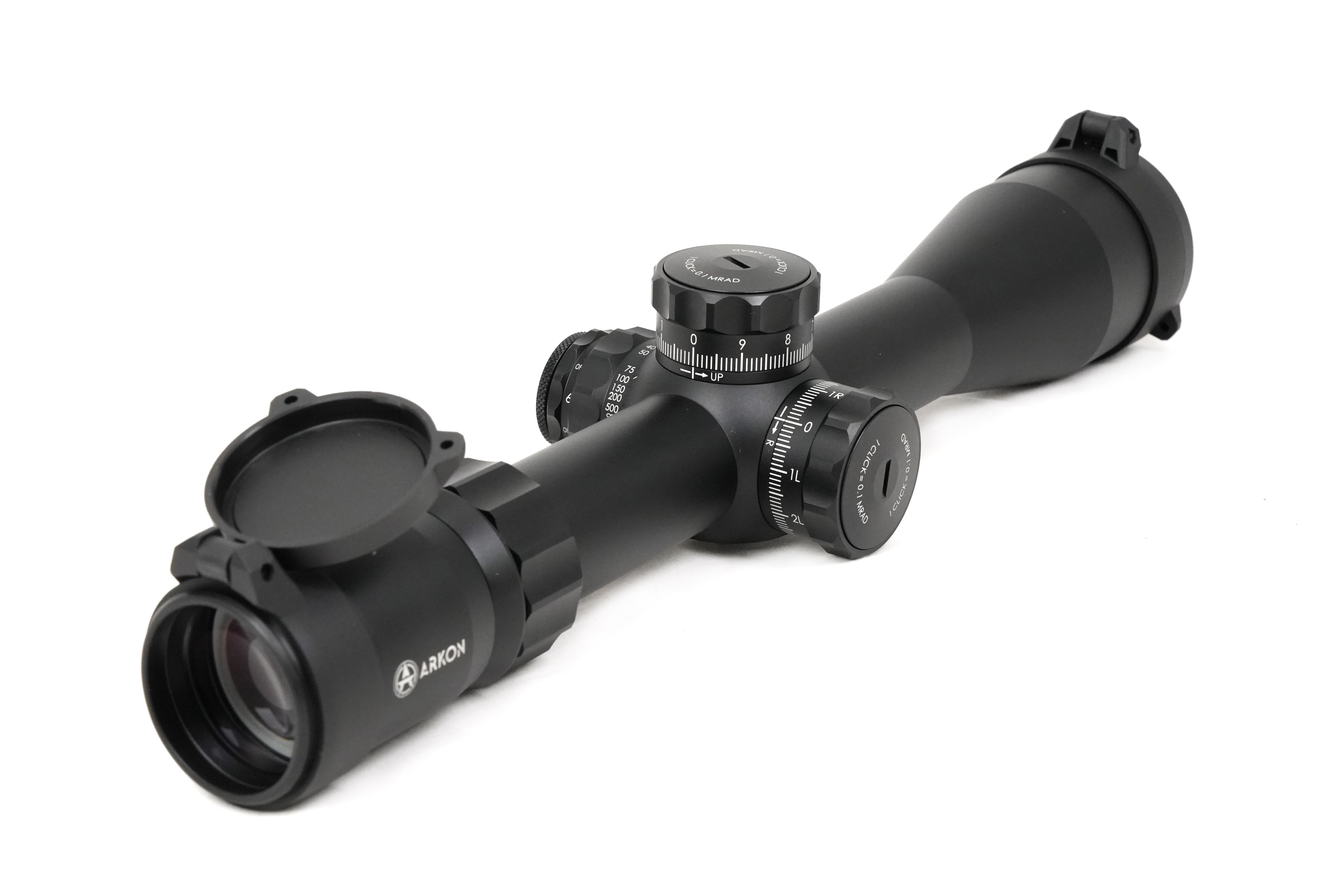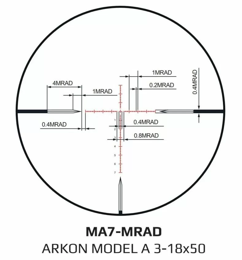 Оптический прицел Arkon Model A 3-18x50 оснащен баллистической прицельной сеткой, расположенной в первой фокальной плоскости. Такое положение обеспечивает сохранение угловых размеров при любом увеличении, что значительно облегчает стрельбу выносом точки прицеливания. Опытные стрелки могут компенсировать падение траектории полета пули на дистанции, учитывать ветровую нагрузку, определять расстояния к цели и скорость ее движения. Также у этой модели имеется многоуровневая подсветка сетки красным цветом. Блок управления интегрирован в боковой барабан отстройки от параллакса.