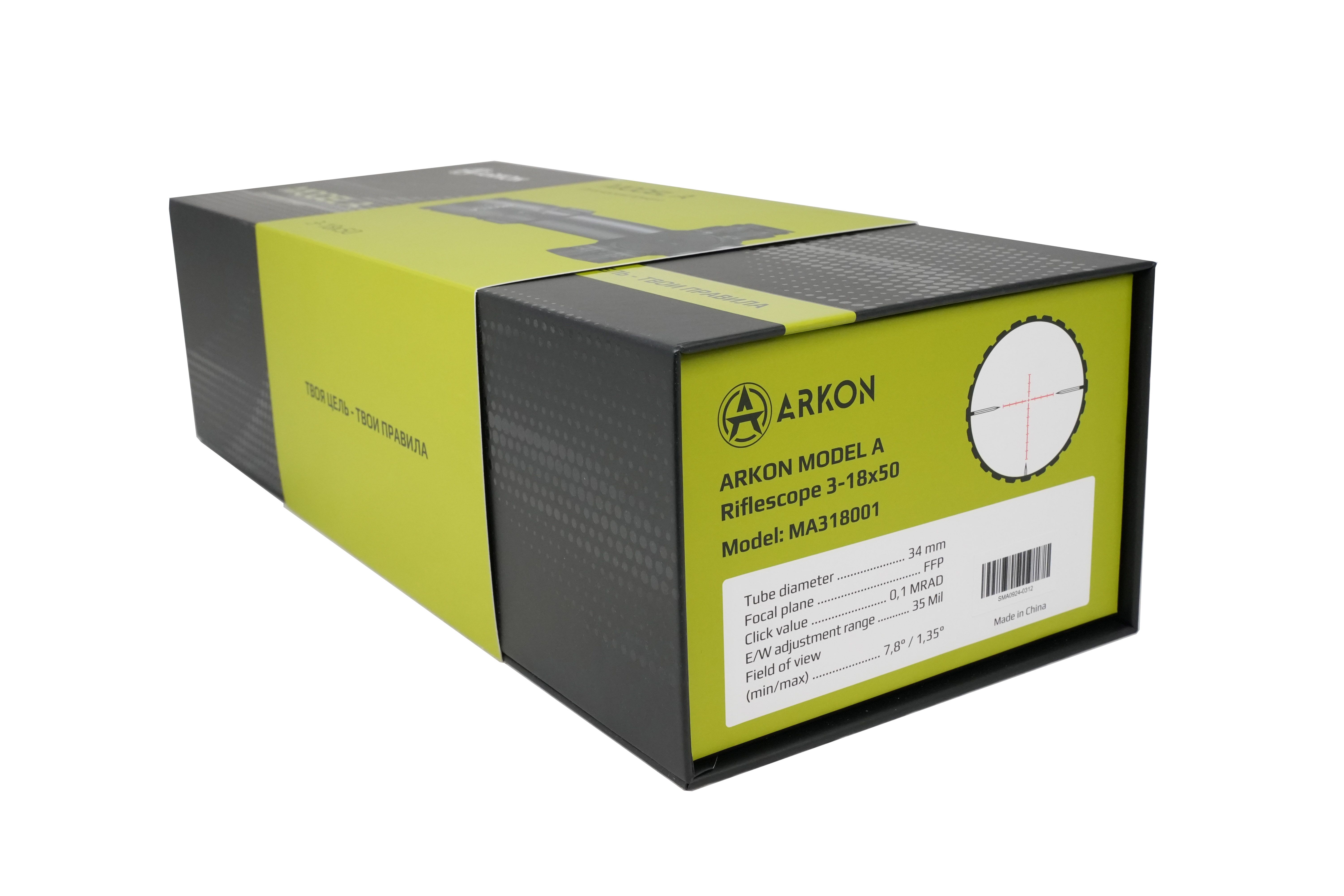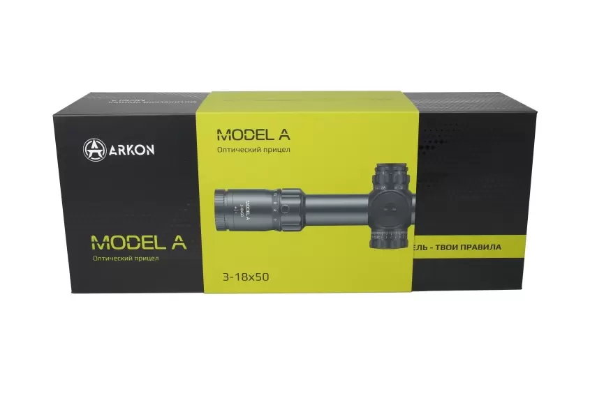 Корпус прицела Arkon Model A 3-18x50 выфрезерован из цельной заготовки высокопрочного алюминия, который используется в авиастроении. Внутренние полости заполняются осушенным азотом, что предотвращает запотевание. Диаметр центральной трубы составляет 34 мм. На внешние поверхности нанесено прочное анодированное покрытие, которое защищает прицел от образования царапин. Оптика успешно прошла испытания на ударные нагрузки с ускорением до 1500g и выдерживает отдачу всех гражданских калибров.