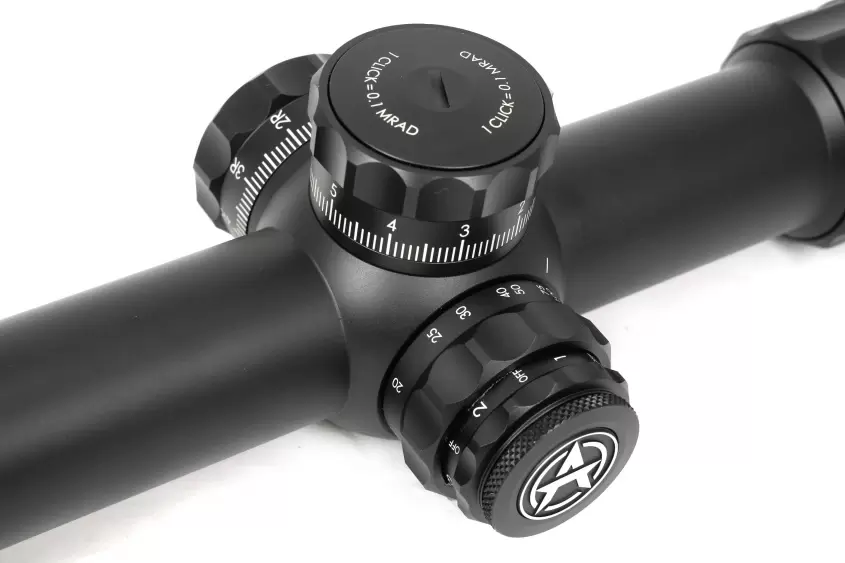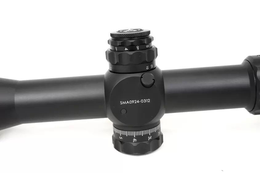 Прицел оснащен тактическими барабанами ввода поправок с разметкой в MIL. Имеется функция сброса настроек и возможность установки нового ноля. Цена клика равна 1/10 MIL, а запас хода по вертикали и горизонтали составляет 35 MIL. Отстройка от параллакса осуществляется с помощью бокового барабана, охватывая диапазон от 15 ярдов до бесконечности.