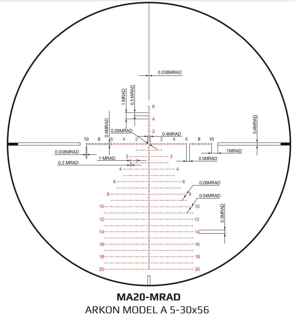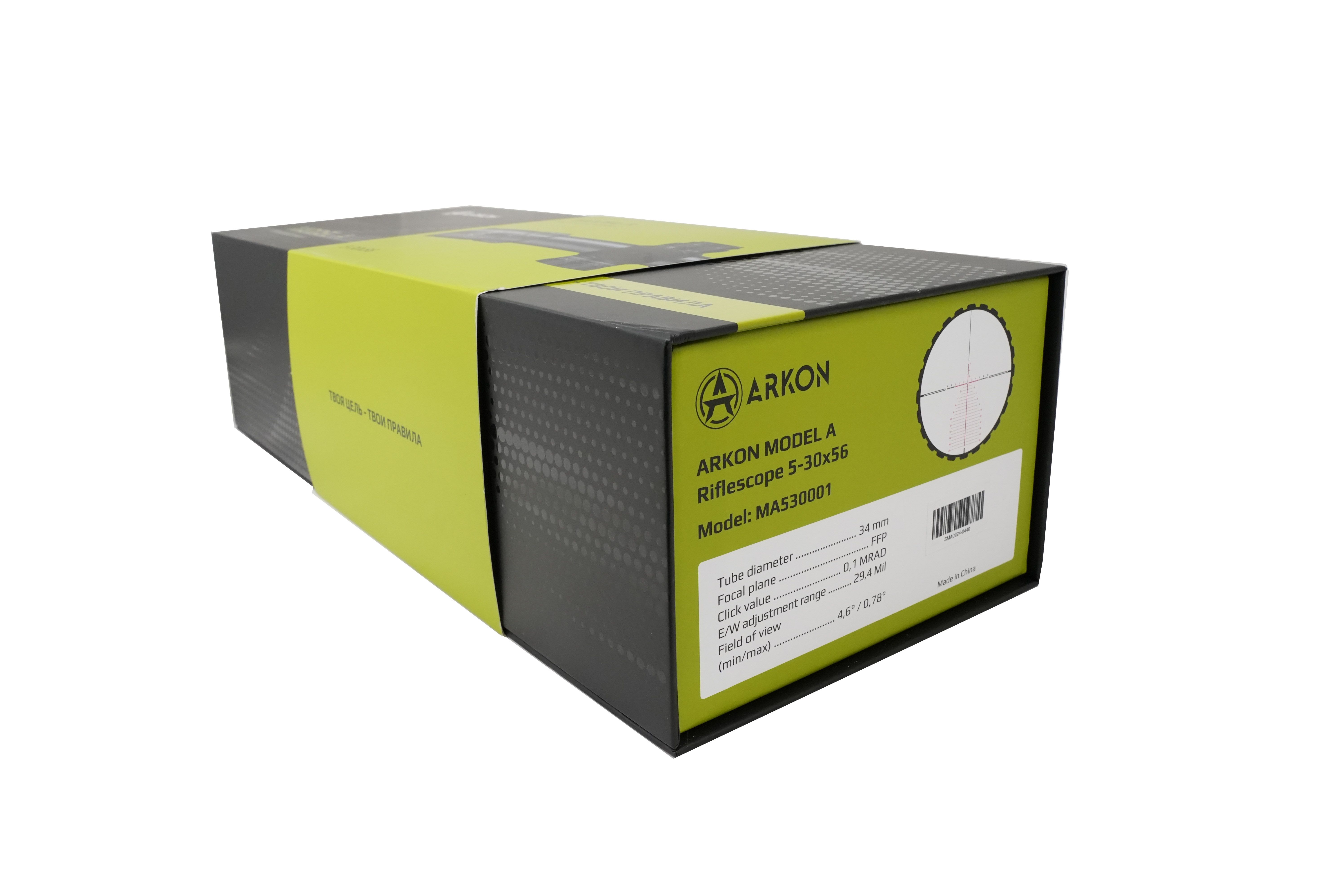 Arkon Model A 5-30x56 оснащен баллистической прицельной сеткой, выгравированной на стекле и расположенной в первой фокальной плоскости. Угловые размеры между элементами остаются неизменными при любом увеличении. Расширенная вертикальная и горизонтальная градуировка позволяет вести стрельбу выносом, контролируя точку попадания в зависимости от дистанции и силы ветра. Сетка имеет многоуровневую подсветку красным цветом. Управление интенсивностью подсветки интегрировано в боковой барабан, доступно 10 уровней регулировки яркости. Питание осуществляется от батареи CR2032.