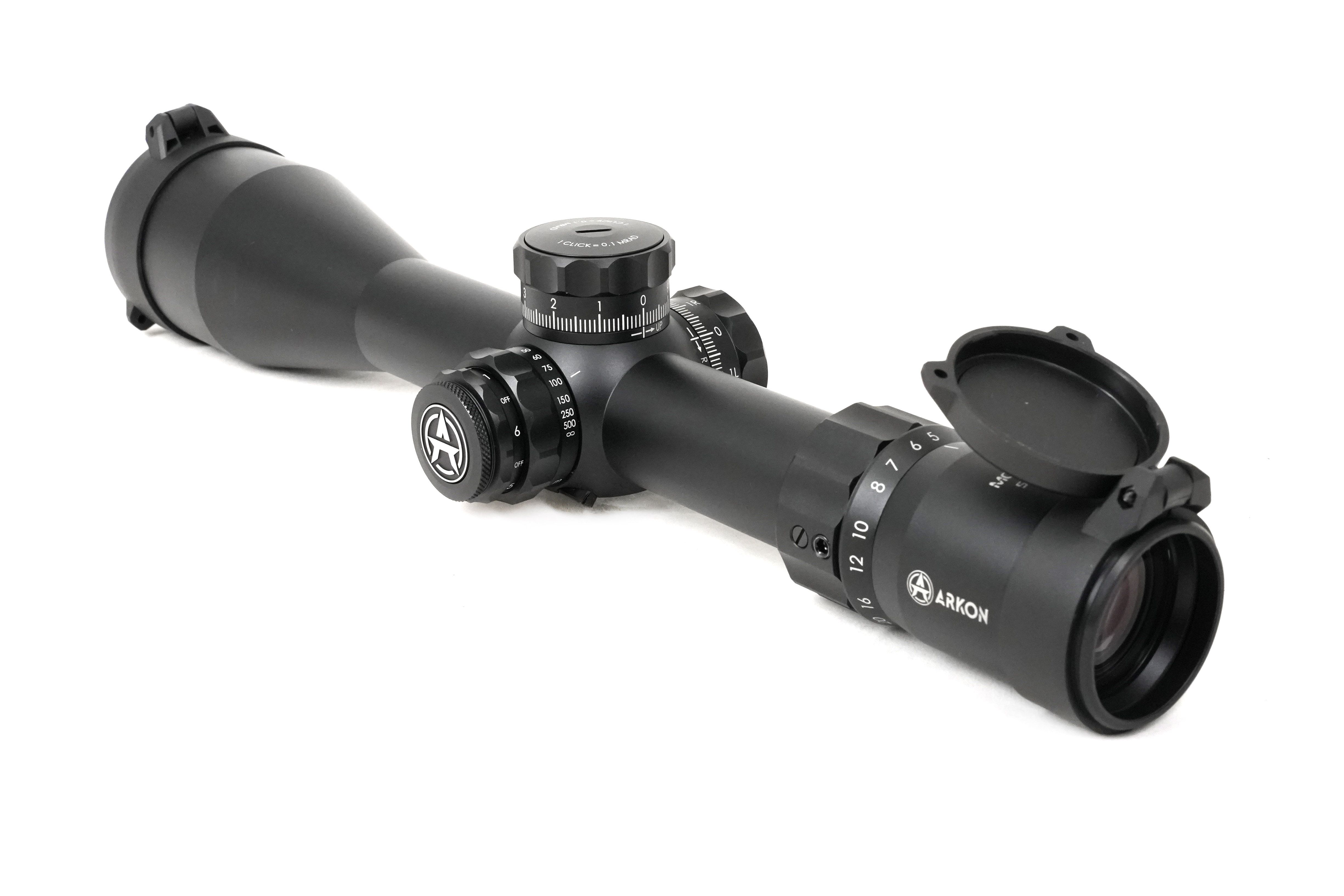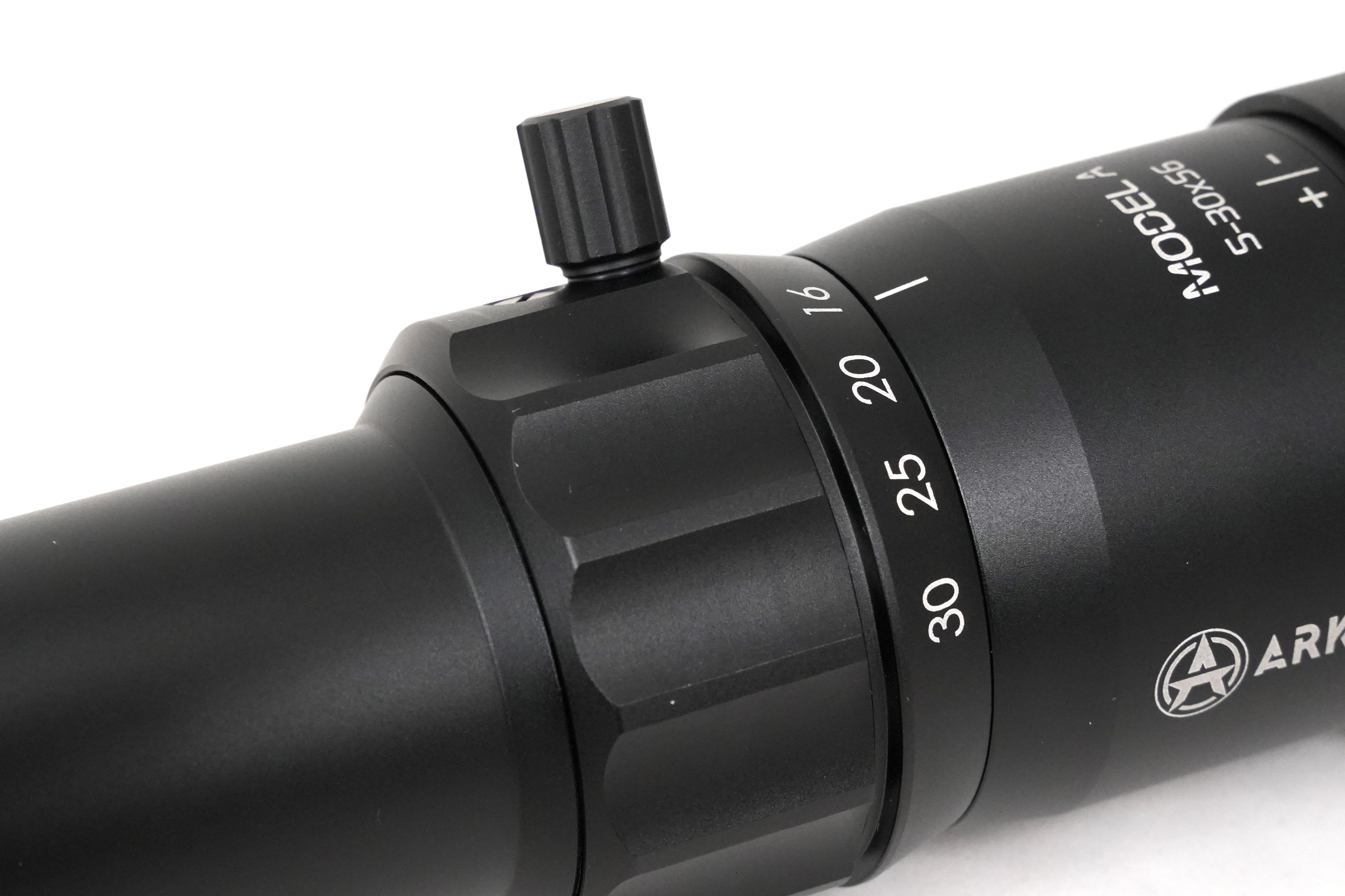 Оптический прицел Arkon Model A 5-30x56 оснащен турелями ввода поправок тактического типа с разметкой в MIL. Имеется функция сброса настроек и установки нового ноля. Шаг выверки равен 1/10 MIL. Запас хода по вертикали и горизонту составляет 23 MRAD. Отстройка от параллакса осуществляется боковым барабаном от 15 ярдов до бесконечности.