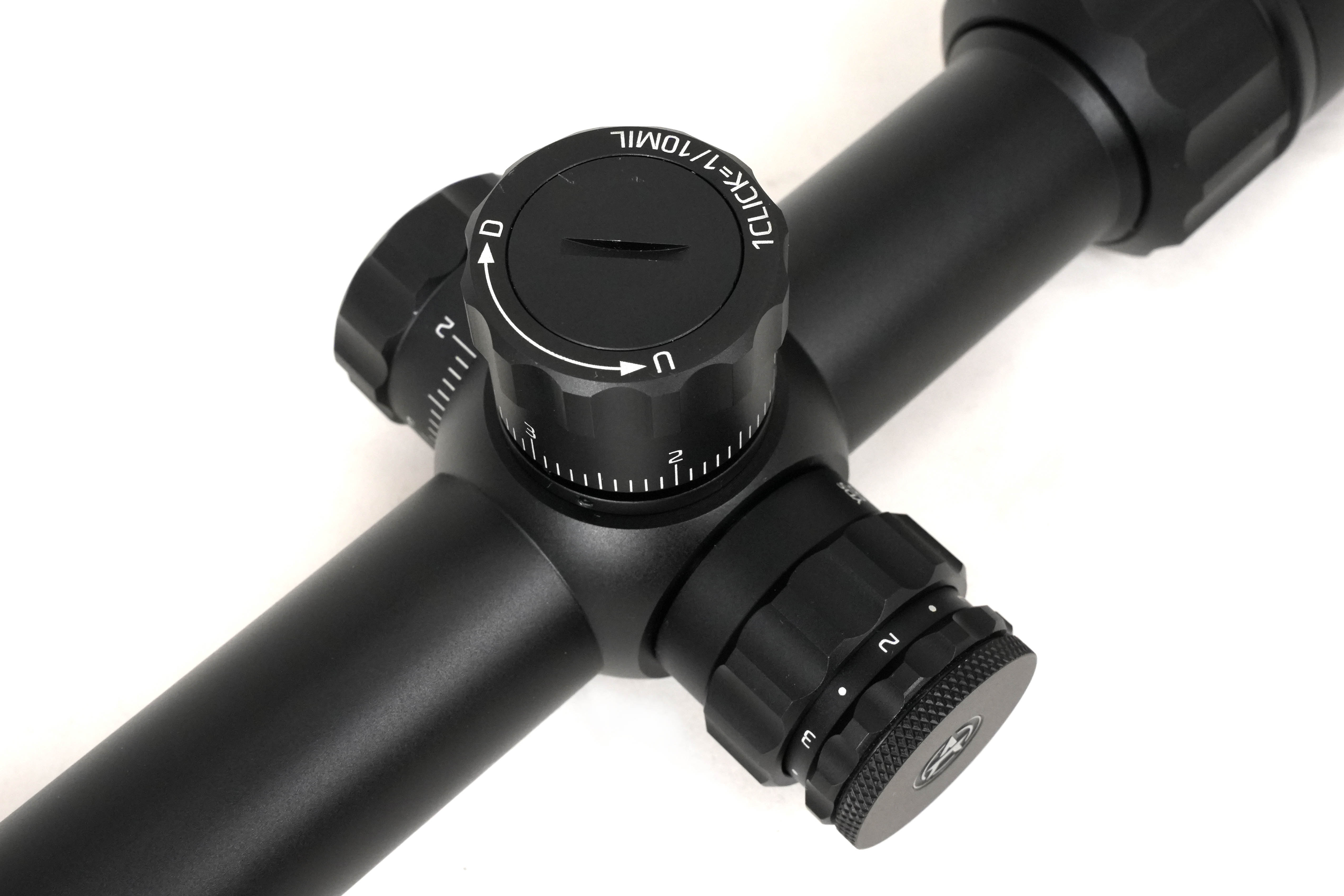 Для внесения изменений в положение прицельной сетки прицел оснащен тактическими турелями ввода поправок с ценой клика 0,1 MRAD. Также имеются функции обнуления и быстрого возврата к нулю ZeroStop. Запас хода прицельной сетки на дальность и силу ветра составляет 17,5 MIL.
