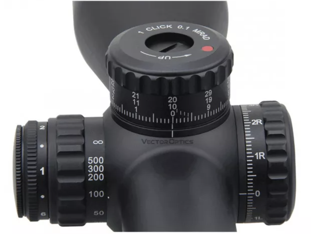 Тактическая выверка и система Zero Stop. Маховики — открытые, с блокировкой положения и разметкой в 1/10 мила (или 10 мм/100 м). У вертикального барабана — счётчик полных оборотов (на 1-м круге — кнопка утоплена, на максимуме — полностью выступает) и система Зеро Стоп. Благодаря Zero Stop можно жёстко заблокировать новый «нуль» после пристрелки: ниже «0» прокрутки не будет, что исключает ввод «отрицательных» поправок и даёт быстрый возврат к нулевой линии прицеливания. В комплекте идёт запасная поворотная часть без Зеро Стоп — для тех, кому такая система не нужна.