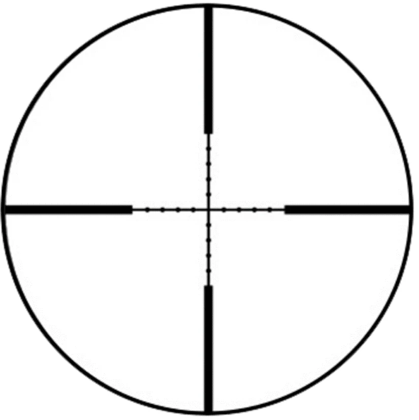 Один из самых распространенных вариантов прицельных сеток. По элементам визира можно определить расстояние к объекту, зная его приблизительные размеры. Также можно вести стрельбу выносом точки прицеливания, беря упреждение на движение и дальность. Внести изменение в положение сетки можно при помощи барабанов выверки. Цена деления 1/10 Мil сместит сетку на 7 мм на дистанции в 100 метров. Закрытый тип барабанов исключает вероятность случайного смещения при плотном контакте с ветвями деревьев, падениях, случайных ударах.