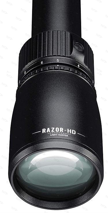 Оптическая схема моделей премиальной серии Vortex Razor HD Light Hunter построена на качественных низкодисперсных стеклах с идеально подобранным оптическим индексом. Качеству изображения могут завидовать передовые модели мировых лидеров индустрии. Значительно повысить светопропускную способность позволило патентованное покрытие FMC XR™ Plus, а защитная пленка ArmorTec® надежно противостоит образованию царапин, также эффективно отталкивает влагу, грязь, пыль. Окулярный узел с плавной работой механики не требует охвата рукой, тактильный выступ для пальца позволяет манипулировать настройками без лишних движений. Также имеется узел диоптрийной корректировки. Выходной зрачок вынесен на расстояние 96 мм. Большой угол поля зрения позволяет оперативно ловить цель и терять из виду движущиеся объекты даже на максимальной кратности.