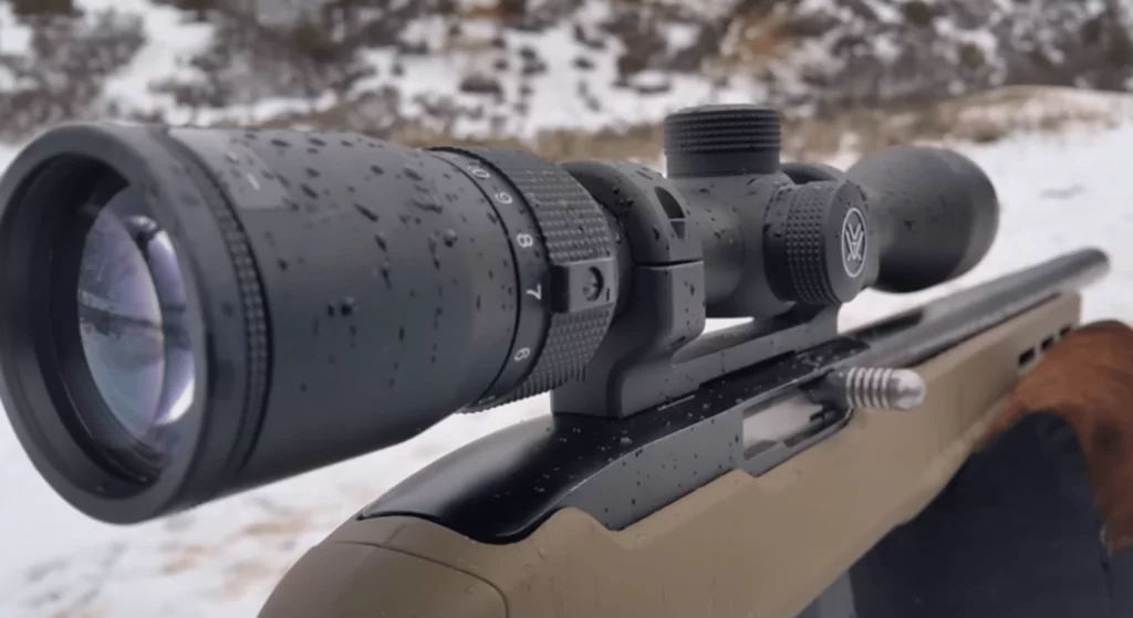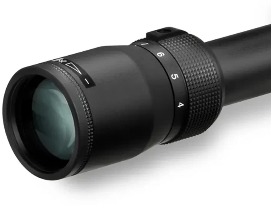 Качественные стекла с многослойным просветлением FMC передают кристально чистое изображение даже при слабом уровне освещения. Быстрофокусируемый окулярный узел позволяет моментально устанавливать максимальную кратность. На низкопрофильном кольце имеется тактильный упор для пальца, для манипуляций с увеличением без полного обхвата рукой. Поле зрения на дистанции в сто метров - 9,9-3,4 м. Это позволяет оперативно ловить цель и совершать точные выстрелы. Удаление выходного зрачка на 78 мм безопасно для применения на крупном калибре. Стрелки с ослабленным зрением могут настроить картинку под себя при помощи функции диоптрийной корректировки. Параллакс выставлен на заводе изготовителе на 91 м.