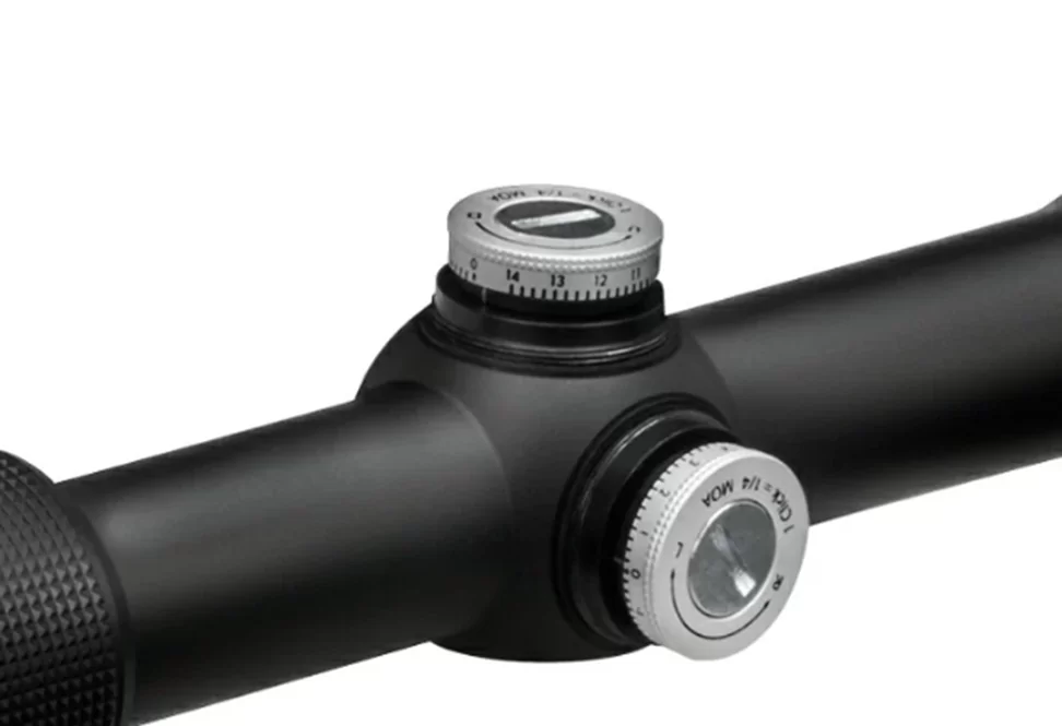 Diamondback 4-12x40 DBK-04-BDC оснащен низкопрофильными барабанами закрытого типа. Для внесения поправок необходимо открутить пластиковые крышки. Цена клика ¼ МОА, запас хода на дальность и ветер по 60 угловых минут. За полный оборот барабана сетка сместится на 15 МОА.