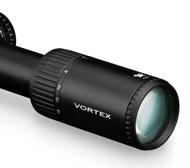 Световой диаметр объектива 44 мм, доступен диапазон кратности от 3 до 15 крат. На оптические элементы нанесено многослойное просветляющее покрытие Fully Multi Coated XR™. Линзы изготовлены из премиального стекла с низким уровнем дисперсии XD™. Стрелкам доступна качественная картинка с реалистичной цветопередачей даже в глубоких сумерках. В качестве дополнительной защиты от пыли и налипания грязи имеется антибликовое износостойкое покрытие ArmorTec®. Для быстрой смены кратности можно установить фирменное кольцо с упором для пальца. Еще одним достоинством является широкий угол поля зрения, позволяющий на максимальном увеличении оперативно находить цель и сопровождать, например, группу передвигающихся животных. Вынос выходного зрачка на 86 мм безопасен для крупного калибра. Параллакс отстраивается при помощи бокового барабана.