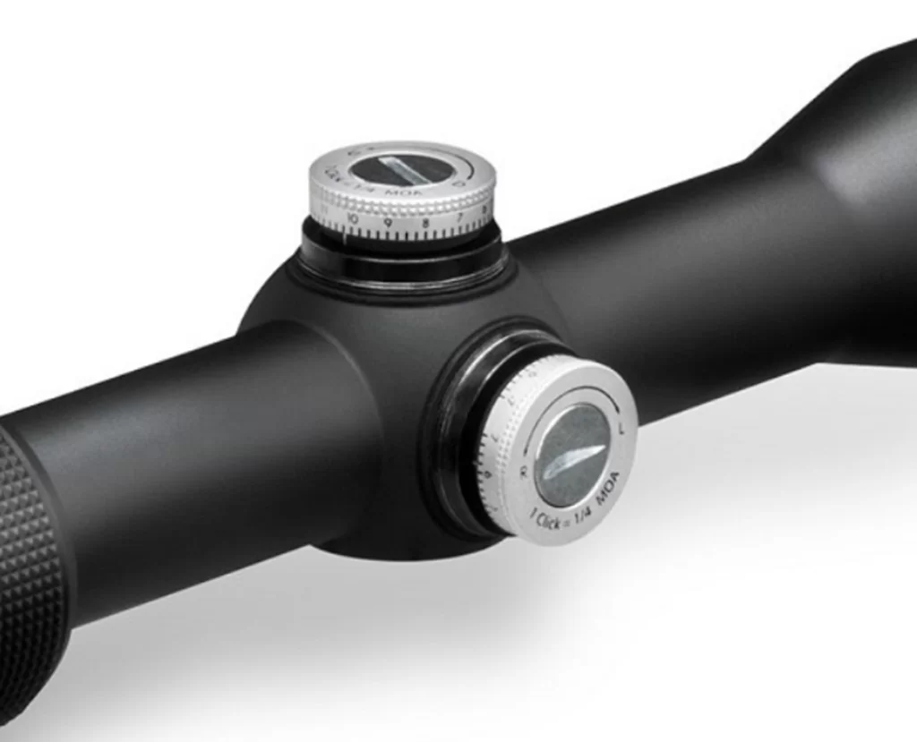 Прицел Vortex Diamondback 1.75-5x32 DBK-08-BDC оснащен низкопрофильными барабанами закрытого типа, есть функция обнуления. Сняв крышки можно внести корректировки в положение прицельной сетки. Цена клика ¼ МОА, ход сетки на дальность и ветер 125 МОА. За один оборот СТП сместиться на 15 угловых минут.