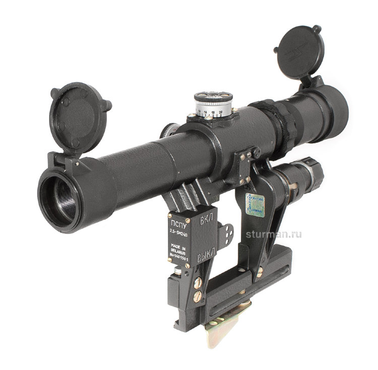 Назначение оптического прицела ПСПУ 2,5-5x24В Прицел дневной оптический ПСПУ 2,5-5x24В предназначен для ведения прицельной стрельбы из охотничьих карабинов «Сайга», «Вепрь», АК и других, с установленной направляющей "ласточкин хвост" на боковой поверхности ствольной коробки. Прицел отличается надёжностью, прочностью и неприхотливостью к условиям эксплуатации. Сетка подобная ПСО с дальномерной ростовой шкалой 1/400 и шкалами вертикальных и боковых поправок, позволяет оценить расстояние до цели и выполнить точный выстрел, корректируя линию огня без использования барабанчиков выверки. Основные характеристики оптического прицела ПСПУ 2,5-5x24В Конструкция влаго- и пыленепроницаема, устойчива к перепадам температур в диапазоне -40°C…+50°C Внутренние полости заполняются азотом Ударная стойкость на нарезном огнестрельном оружии – 2100…3600 Дж (данные из таблицы дульной энергии https://sturman.ru/category/pricely/) Крепление: боковая планка «ласточкин хвост» Увеличение 2,5 – 5 крат, объектив – 24 мм Угловое поле зрения 8°30' - 5°30' Удаление выходного зрачка 77 мм (при 2,5x) – 61 мм (при 5x) Масштабируемая прицельная сетка ПСО-подобная с ростовой дальномерной шкалой 1/400 и шкалами вертикальных и горизонтальных поправок Подсветка сетки красного цвета, питание 3,0В от 2х элементов AG-13 (LR-44). Маховики ввода поправок по вертикали и горизонтали тактического типа, смещение точки прицеливания при вращении маховичка на 0,5 деления (1 клик) – 5 мм /100 м Конструктивные особенности оптического прицела ПСПУ 2,5-5x24В Прицел оптический ПСПУ 2,5-5x24В рассчитан на отдачу патронов калибром 7,62 x 54 R и 7,62 x 39. Во избежание запотевания линз при резких перепадах температуры, сборка прицела на завершающих стадиях ведется в азотной камере, таким образом во внутренних полостях прицела отсутствуют водяные пары. Окуляр прицела настроен на "нормальное зрение": -1 дптр. Прицел устанавливается на оружие с помощью цельного с корпусом бокового крепления на планку «ласточкин хвост» (до упора со стороны приклада) и фиксируется зажимным рычагом. Регулировка усилия зажима производится перестановкой рычага на зубчатой головке зажимной гайки. Для корректировки линии прицеливания и определения СТП используются барабанчики ввода поправок (с разметкой на белом фоне). Вращение маховичка на 0,5 деления (1 клик) соответствует перемещению линии прицеливания на 5 мм на расстоянии 100 м. Для сброса настроек на «ноль» необходимо ослабить винты на гайке маховиков и повернуть оправу до совмещения «0» с индексом на корпусе. Для возврата к заводским настройкам необходимо совместить красные штрихи на гайке и подвижной части барабанчиков. Масштабируемая сетка с дальномерной шкалой позволяет при любой кратности от 2,5x до 5х определить расстояние до объекта высотой 1м на дистанции до 400 м. Для ведения стрельбы в условиях недостаточного освещения предусмотрена возможность подсветить прицельную сетку свечением светодиода красного цвета. Всю необходимую информацию о прицеле ПОСП 2,5-5x24 Т (Тигр 1/400) вы можете получить, позвонив нам по телефону 8 (495) 989 10 56 или разместив вопрос на сайте нашего интернет-магазина. Комплект поставки: Оптический прицел ПСПУ 2,5-5x24В Откидные (flip-top) крышки объектива и окуляра Наглазник Футляр Руководство по эксплуатации Технические характеристики оптического прицела ПСПУ 2,5-5x24В Основные ТТХ Оптические характерис