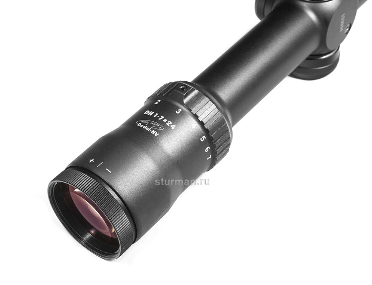 Линия прицелов Dedal DH – это полностью отечественная разработка, по своим оптико-физическим характеристикам (отсутствие дисторсии, разрешение и светопропускание, цветопередача, видимое поле зрения, удаление выходного зрачка, точность механизма выверки, ударная прочность) не уступающая лучшим мировым брендам. Основное назначение прицела Dedal DH 1-7x24 Оптический прицел «премиум» класса Dedal DH 1-7x24 создан профессионалами в области наблюдательной оптики, предназначен для установки на различные виды охотничьего оружия с целью наблюдения, поиска и опознавания целей, ведения прицельной стрельбы на ближних и средних дистанциях. Основное применение – охота. Основные характеристики прицела Dedal DH 1-7x24 Диапазон смены увеличения: от 1x до 7x Хороший обзор, широкое поле зрения Выгравированная на стекле прицельная марка MRH-D1 типа L4: расположение – фокальная плоскость окуляра, истинные угловые значения – при 7x Подсветка центральной точки красным цветом с многоступенчатой цифровой регулировкой яркости свечения (7 степеней), запоминание последнего выставленного значения, автоматическое отключение Батарейный отсек – сбоку на корпусе, питание – от 1 батарейки CR 2032 (входит в комплект поставки) На всех оптических поверхностях – многослойное просветляющее покрытие Высококонтрастное изображение с естественной цветопередачей, отсутствие дисторсии при увеличении кратности и смещении зрачка глаза Механизм выверки с чёткими тактильными щелчками, широкий диапазон выверок Заводская фокусировка объектива на 100 метров Диоптрийная настройка окуляра в интервале от +2 до -3,5 диоптрий Посадочный диаметр - 30 мм Материал корпуса и механизмов - высокопрочные алюминиевые сплавы с анодированным покрытием, надёжная защита от коррозии и агрессивного воздействия внешних сред Высокая ударная стойкость на оружии крупного калибра (.375H&H) Герметичная конструкция (IPX7), заполнение осушенным азотом Надёжная работа при низких (до -50°C) температурах Эргономичный современный дизайн, компактные размеры и небольшой вес Полностью отечественная разработка, быстрый и надёжный сервис Конструктивные особенности прицела Dedal DH 1-7x24 Проведя предварительные исследования и изучив особенности оптических прицелов от известных производителей, компания "Дедал-НВ" выпустила на рынок наблюдательной оптики серию дневных прицелов для ходовой / загонной охоты Dedal DH, которая в 2015 году была дополнена новой моделью – DH 1-7x24. Диапазон кратности позволяет использовать прицел как полноценный коллиматор (при 1x): обеспечивается широкий угол обзора, удобно вести наблюдение за движущимися целям или одновременно отслеживать группы объектов, а также стрелять навскидку на близких дистанциях. 7-кратное увеличение позволяет распознавать и точно поражать цели на больших расстояниях. Улучшенная оптическая система обеспечивает качественное изображение с высоким разрешением по центру и без искажений по краю поля зрения, свойственных моделям низкого и среднего класса. На все оптические поверхности нанесено многослойное просветление, повышающее светопропускание и улучшающее контрастность видимой картинки. Объектив прицела сфокусирован на 100 м, однако благодаря большой глубине резкости параллакс отсутствует практически на любых расстояниях. Прицельная марка MRH-D1 типа L4 расположена во II фокально