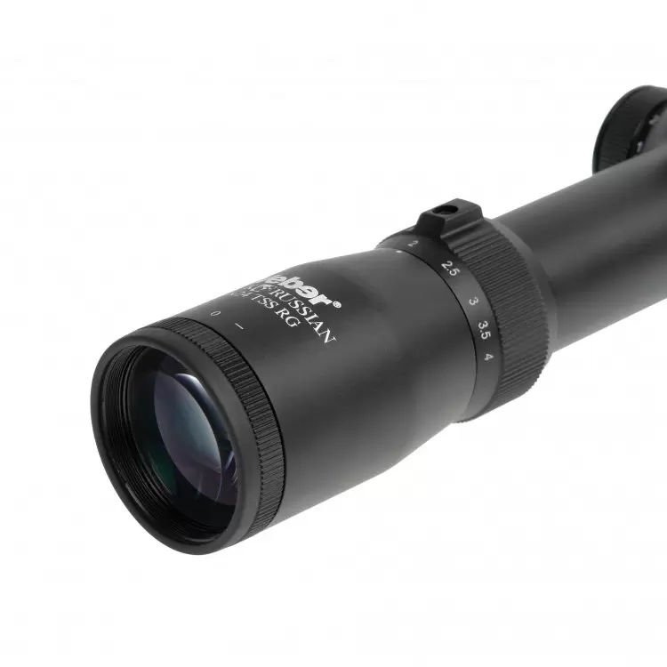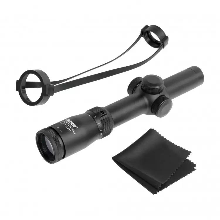 Назначение Прицел Veber Black Russian 1-4х24 TSS RG — компактный «загонник» нового поколения с улучшенной конструкцией окуляра, максимальным углом обзора и правильной выверкой с шагом 1/2MOA. Рассчитан на калибр 7,62x54 мм и PCP пневматику, подходит для темповой, практической и спортивно-развлекательной стрельбы на малых дистанциях. Ключевые параметры  4-кратный зум. Широкое поле зрения. TSS окуляр. Выгравированная на стекле сетка FireDot (SFP). Подсветка «точки», по 5 уровней красного и зелёного. Низкие закрытые барабанчики. Выверка с шагом 1/2MOA. Труба 30 мм. Компактность. Защита от воды и пыли IP67. Ударная стойкость: «огнестрел» до 4400 Дж, пневматика до 15 Дж.  Конструктивные и функциональные особенности 4-кратный зум. У модели классическое для «загонника» сочетание кратности и диаметра объекта: на 1x — картинка без искажений и удобное прицеливание двумя глазами, на 4x — улучшенная детализация, с сохранением хорошего обзора, и более точное прицеливание по месту. Увеличение прирастает с шагом 0,5x, для более плавной регулировки (и под руку в перчатке) на колесо смены кратности можно поставить рычажный упор. Наводить объектив на фокус не требуется — параллакс уже отстроен на 90 м, а подстройка диоптрий выполняется плавным выдвижением окуляра (аналог Fast Focus). Панорамный обзор и светлая картинка. Прицел Вебер Black Russian 1-4x24 TSS RG отличается очень широким полем зрения — 22,7...6 (или 41,8...10,5 м/100 м), так что обзорность у него на 10-15% лучше, чем у аналогичных моделей 1-4x24. «Тоннельный» эффект устраняется при помощи TSS окуляра (или окуляра с тонким краем), а светопропускание сохраняется на уровне 90% за счёт большого объектива 24 мм и качественного просветления линз. Охотник может быстро «ловить» глазом набегающего зверя и эффективно использовать оптику даже в ранних сумерках. Загонная сетка FireDot (перекрестие с подсвеченной точкой) — модификация German #4: зверя можно быстро «поймать» в перекрестье, затем целиться по «плавающей» точке в центре. Для привлечения внимания и лучшего выделения на ярком солнце, в тени или на сложном фоне точку можно подсветить красным или зелёным цветом (по 5 уровней). Поскольку сетка находится на 2-м плане (SFP), то при любой кратности будет выглядеть одинаково и не перекроет даже самую маленькую цель. Шаг выверки 1⁄2 MOA (или 14,5 мм/100 м). Барабаны простые, минимальной высоты, чтобы не мешали обзору. Рифлёный выступающий край поворотной части упрощает настройку рукой в перчатке, а навинчивающиеся крышки защищают от случайного смещения. Клики не шумные, на слух и тактильно распознаются, а каждый второй полный MOA отмечен соответствующим числом. Для любой погоды и среднего калибра. Прицел лёгкий (400 г) и компактный (254 мм в длину), как и положено «загоннику», выполнен в цельнометаллическом корпусе диаметром 30 мм, с чёрной матовой отделкой. Согласно ТТХ производителя, подойдёт как для PCP пневматики, так и для «огнестрела» под калибр .308 Win, и будет без протечек и внутреннего запотевания работать в дождь и на морозе до -25C. Для установки на оружие потребуется дополнительно приобрести подходящие кольца, например, Vector Optics 30 mm STEEL LOW WEAVER QD RINGS, или моноблок с посадочным диаметром 30 мм. Комплектация  загонный прицел Veber Black Russian 1-4x24 TSS RG защитные крышки, на резинке, с прозрачным торцом батарейка CR2032 салфетка тканевая, для очистки линз инструкция  Тактико-технические характеристики      