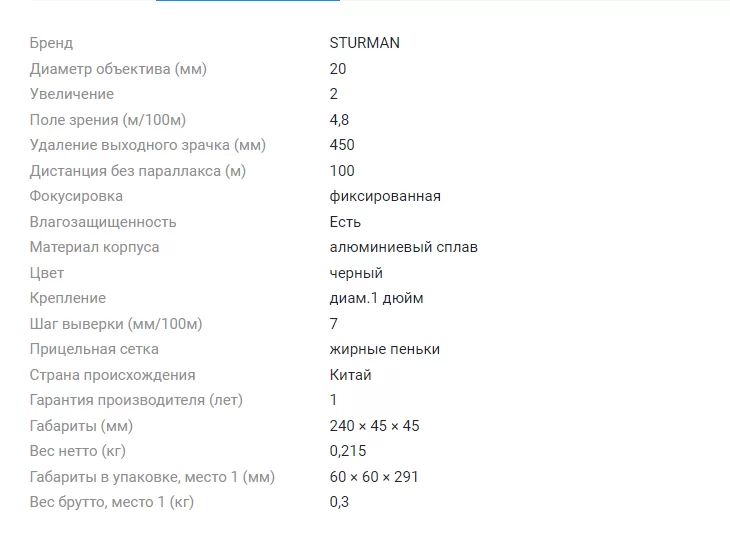 Назначение и особенности Прицел Sturman 2x20 предназначен для установки на оружие, конструкция и особенности которого предусматривают большое расстояние от оптического прибора до глаза стрелка.Для пистолетов, арбалетов. Ключевые параметры  Удаление выходного зрачка - 450 мм. Заводская отстройка от параллакса на 100 м. Жирная, легко заметная сетка "3 пенька". Посадочный диаметр 25,4 мм (1 дюйм). Закрытые барабанчики выверки, шаг 7 мм на 100 м. Диоптрийная подстройка окуляра в пределах +\-2 диоптрии. Бленда объектива для защиты от паразитных солнечных лучей.  Комплектация  прицел на пистолет Sturman 2x20, защитные прозрачные крышки со встроенным жёлтым светофильтром.  Статья из журнала "Калибр" о ранней модификации этого прицела и опыте его использования с карабином "Сайга". 2008г.Производитель может вносить изменения в комплектацию, конструкцию и/или программное обеспечение прибора без предварительного уведомления пользователей