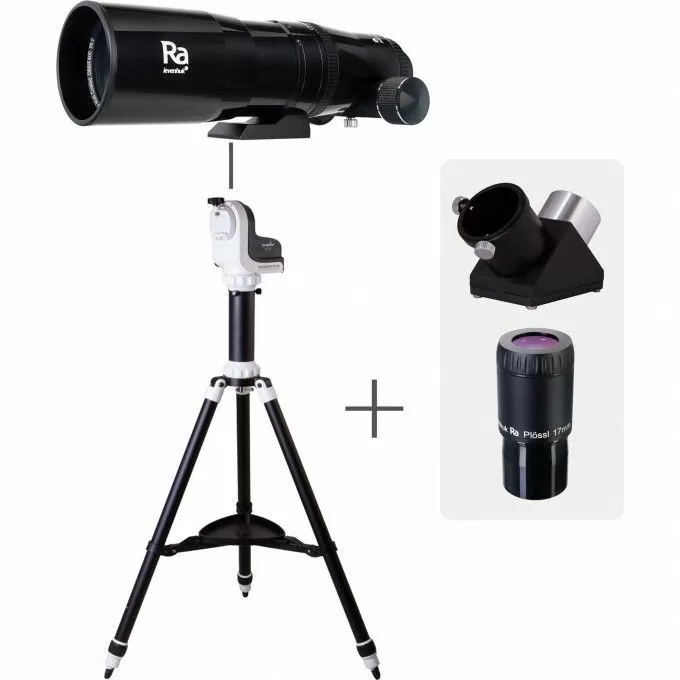 Телескоп дополнен диагональным зеркалом Sky-Watcher 90° с посадочным диаметром 1,25". Оно дает неперевернутую картинку, позволяя наблюдать не только за космическими, но и за наземными объектами с большим удобством. Также в комплекте идет окуляр Levenhuk Ra Plössl с фокусным расстоянием 17 мм – это универсальный окуляр, который дает широкое поле зрения и качественное изображение без искажений.