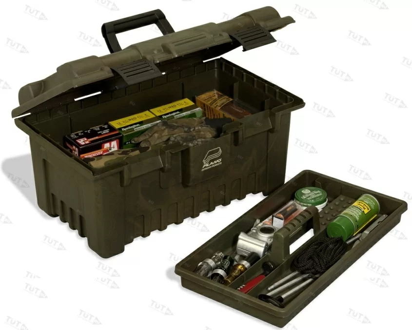 Ящик, снабженный прорезиненной эргономичной ручкой, закрывающимся отделением для оружейных принадлежностей.