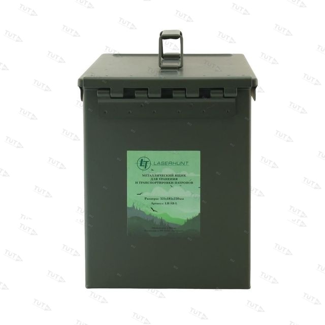 • Большой металлический ящик Laserhunt для патронов произведен из стали и имеет внешнюю отделку выполненную матовой эмалью оливкового цвета.