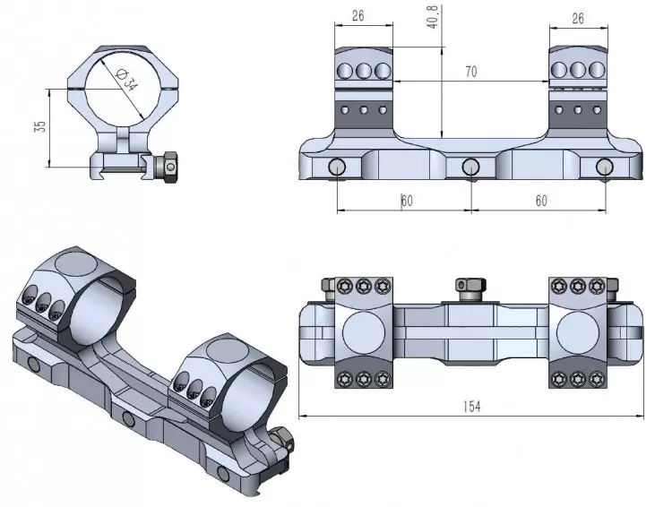 Назначение Крепление Vector Optics 34 mm X-ACCU Medium (SCTM-60) — моноблок с кольцами для надёжной фиксации прицелов с внешним диаметром объектива до 56 мм и корпусом 34 мм на огнестрельном оружии с сильной отдачей. Технические параметры  Максимальный внешний диаметр объектива прицела — 56 мм. Кольца: посадочный диаметр 34 мм, толщина 26 мм, по 6 винтов torx. Расстояние от центра кольца до планки — 35 мм (Medium). Расстояние между кольцами — 70 мм. Противооткатные упоры. Материал кронштейна: алюминий 6061-Т6 с анодированием Основание: планка Weaver / Picatinny, 21 мм. Фиксация 3 болтами. Усилие затяжки болтов в основании: рекомендуемое — 25 дюймов/фунт (2,8 Нм), максимальное — 45 дюймов/фунт (5,08 Нм). Рекомендуемое усилие затяжки винтов полуколец: 18 дюймов/фунт (2,03 Нм). Изготовление и обработка на станках с ЧПУ. Ключ T15 в комплекте. Размеры (ДxШxВxТ) 154x50x59 мм, вес 250 мм. Производитель может вносить изменения в комплектацию, конструкцию и/или программное обеспечение прибора без предварительного уведомления пользователей