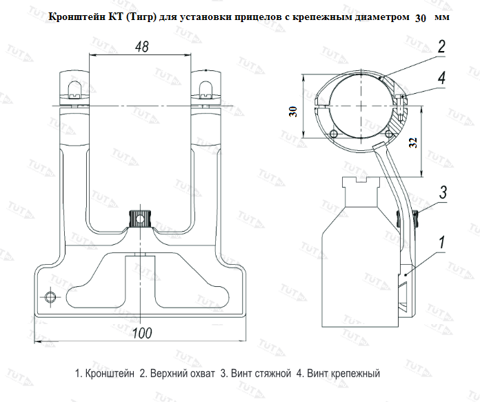 Кронштейн КТ-30/ТИГР предназначен для установки оптических прицелов на карабины «Тигр», а также на карабины КО-44 и КО-91 (с боковой планкой типа СКС-К). Кронштейн надёжно удерживает установленную оптику при использовании стрелком мощных патронов. Высота установленного оптического прицела над ствольной коробкой составляет 32 мм, что позволяет стрелку, при необходимости применения оружия на короткой дистанции, использовать открытый прицел.