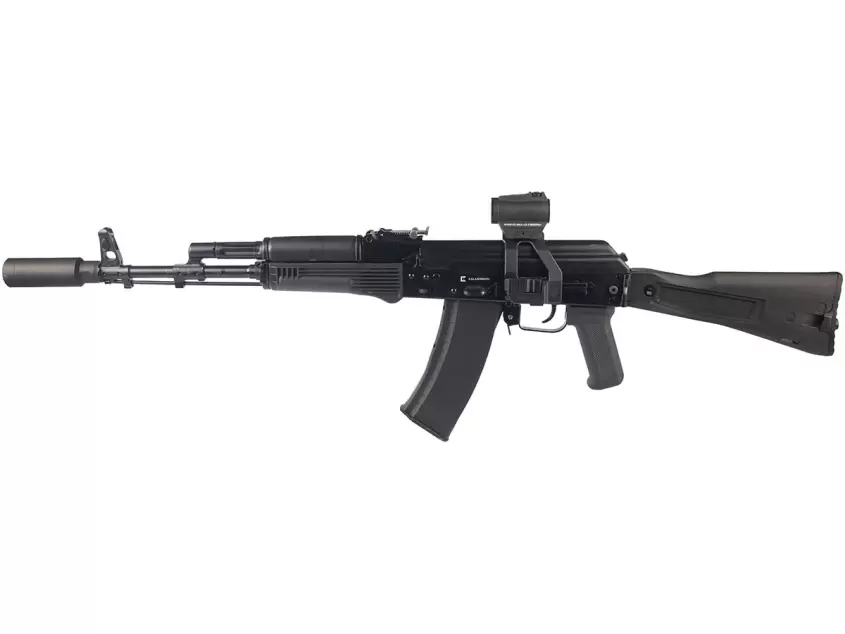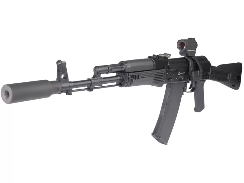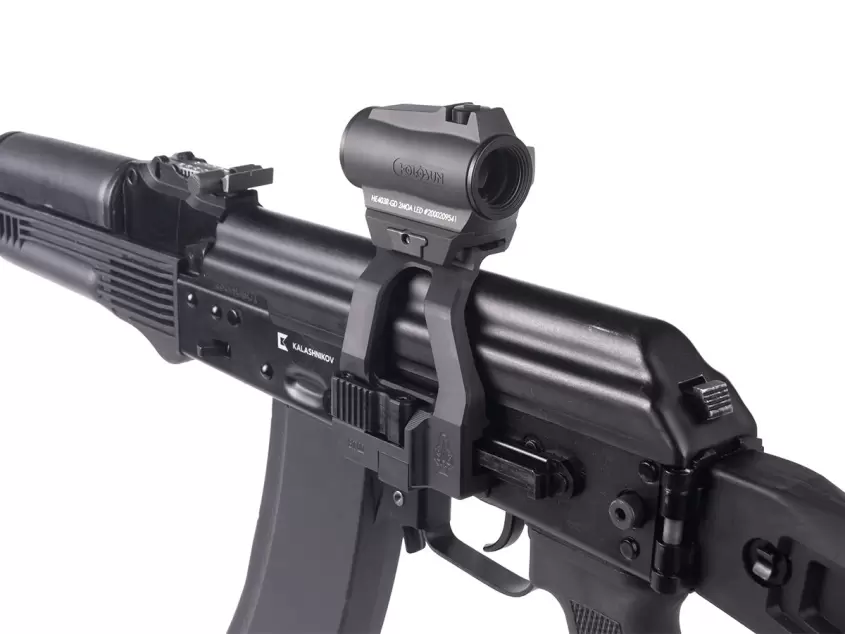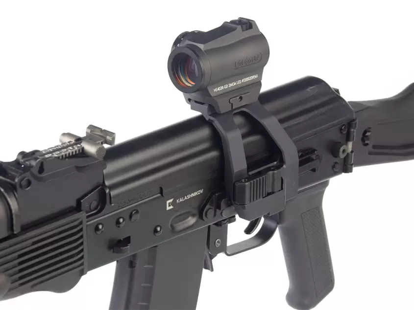 Компактный и лёгкий кронштейн с планкой Пикатинни, фрезерованный из бруска высокопрочного алюминиевого сплава, предназначенный для установки небольших коллиматорных прицелов типа Aimpoint Micro или ACOG на базу АК без внесения каких-либо изменений в оригинальный карабин.