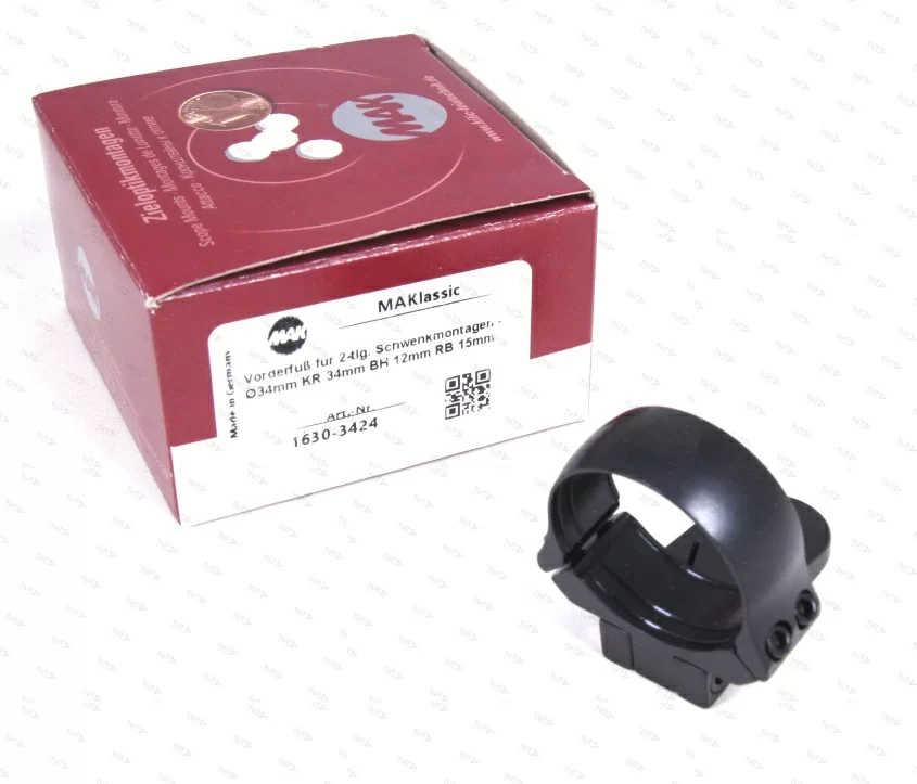 Передняя нога MAK с кольцами диаметром 34 мм для быстросъемного основания (призма шириной 15 мм). Имеет ротационный механизм фиксации. Материал крепления — высокопрочный анодированный алюминиевый сплав. Диаметр кольца — 34 мм, высота установки — 12 мм.