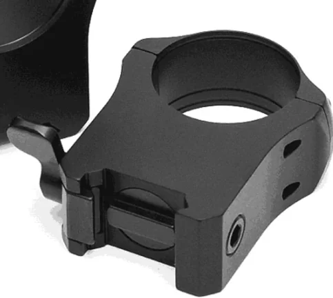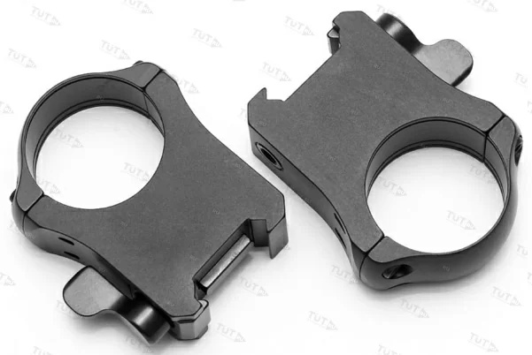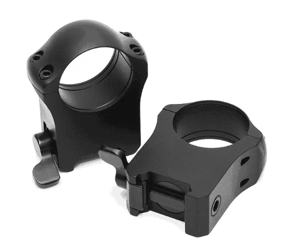 Эти кольца изготовлены из высокопрочного алюминиево-титанового сплава с анодированным покрытием, которое устойчиво к воздействию пороховых газов, смазки. Все фиксирующие элементы, включая детали, контактирующие с планками и рычажные замки, выполнены из закаленной стали. Быстросъемная рычажная система MAKuick гарантирует быструю и легкую смену оптики, сохраняя при этом точное положение средней точки попадания (СТП) при повторной установке в те же пазы на планке. Усилие зажимного механизма регулируется.