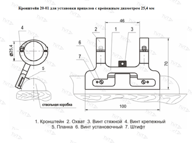 Кронштейн позволяет прикрепить к ружью различные оптические прицелы с крепежным диаметром 1 дюйм (25, 4мм). Конструкция крепления продумана таким образом, что стрелок может использовать не только оптический прицел, но и наружный. Кронштейн содержит в комплекте специальный вороток и планку для установки.