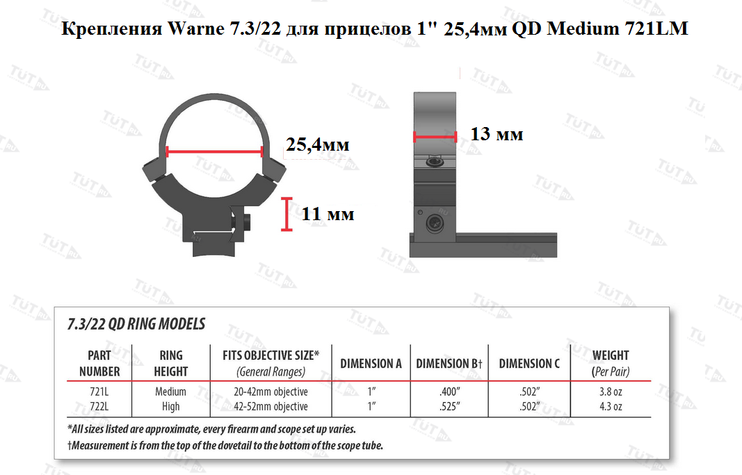Технические характеристики быстросъемных креплений Warne для прицелов 1”/25,4мм (Medium 721LM QD)