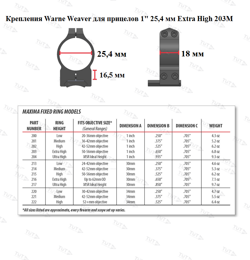 Технические характеристики верхних креплений Warne Maxima для прицелов 25,4мм/Weaver (203M Fixed)