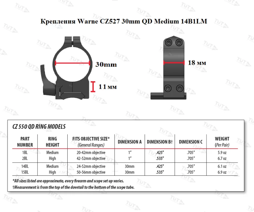 Быстросъемные крепления Warne прицелов 30 мм для CZ527 (14B1LM QD) |